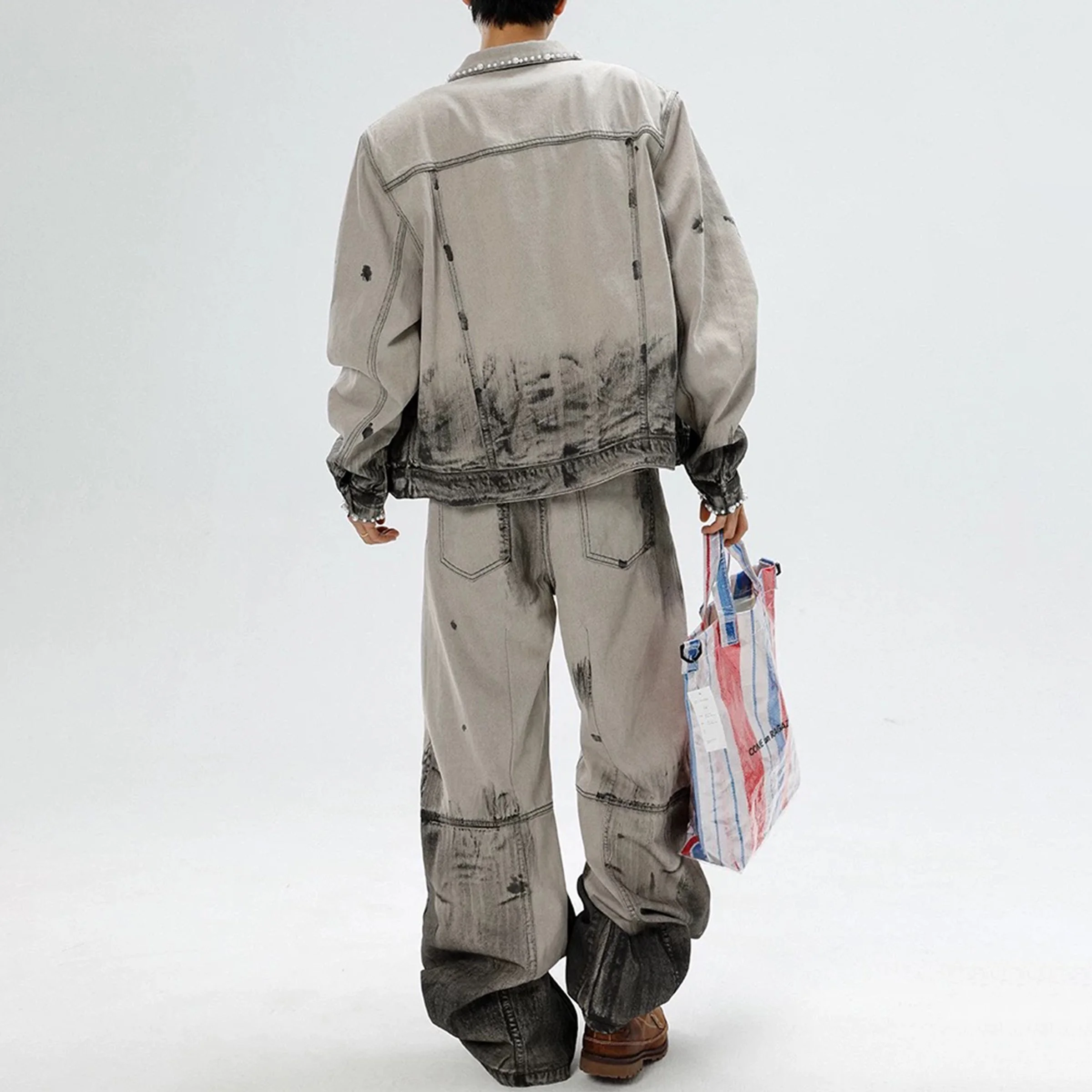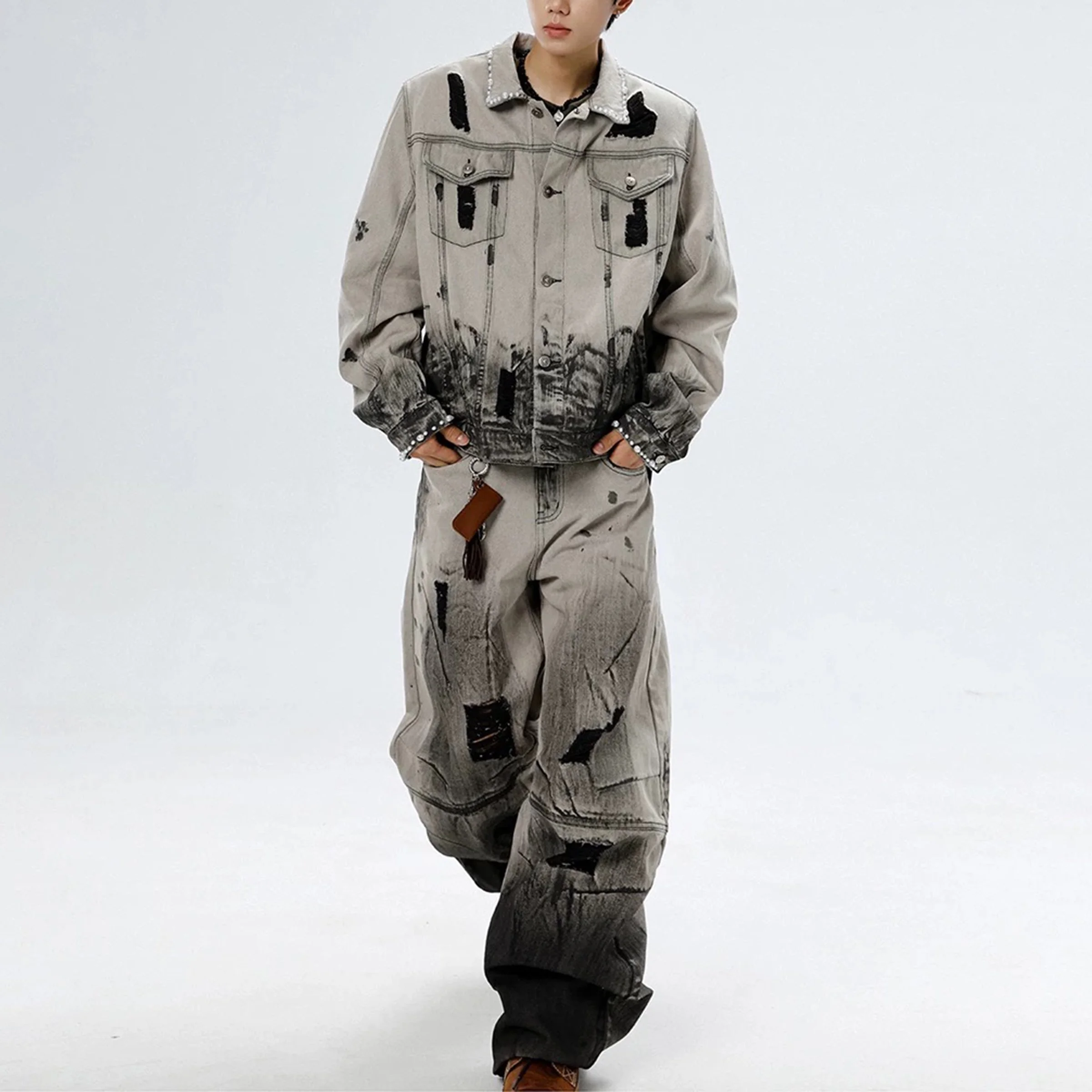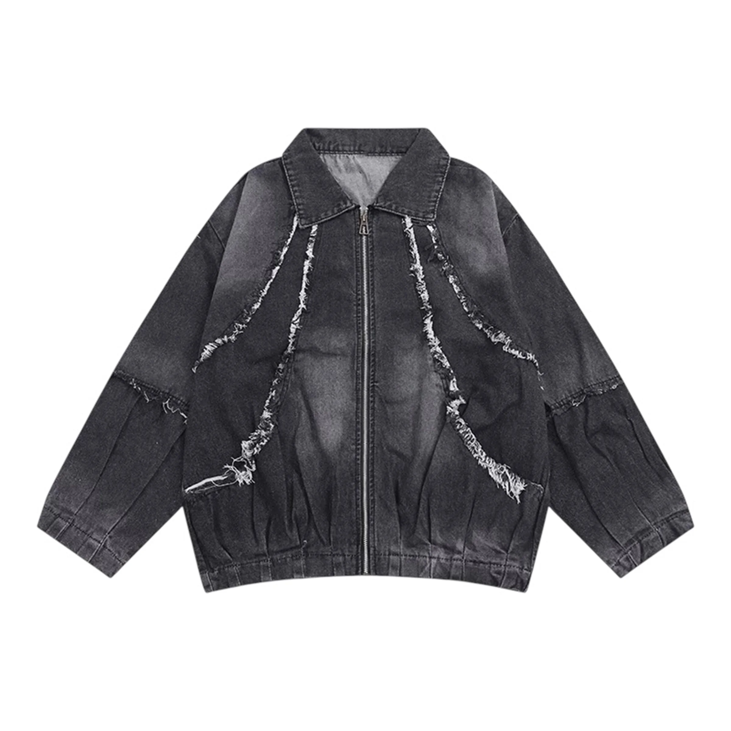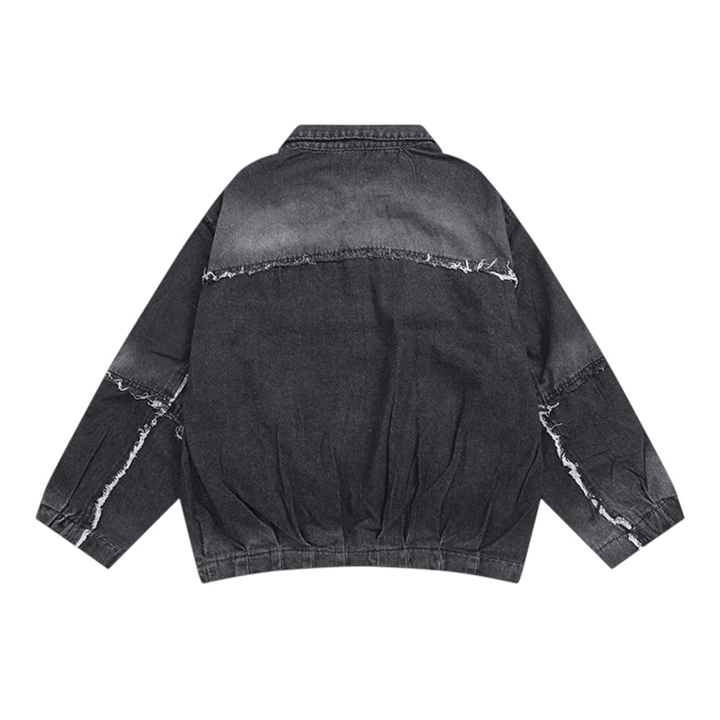 Men’s Washed Black Gradient Denim Jacket with Ripped Detail and Oversized Fit