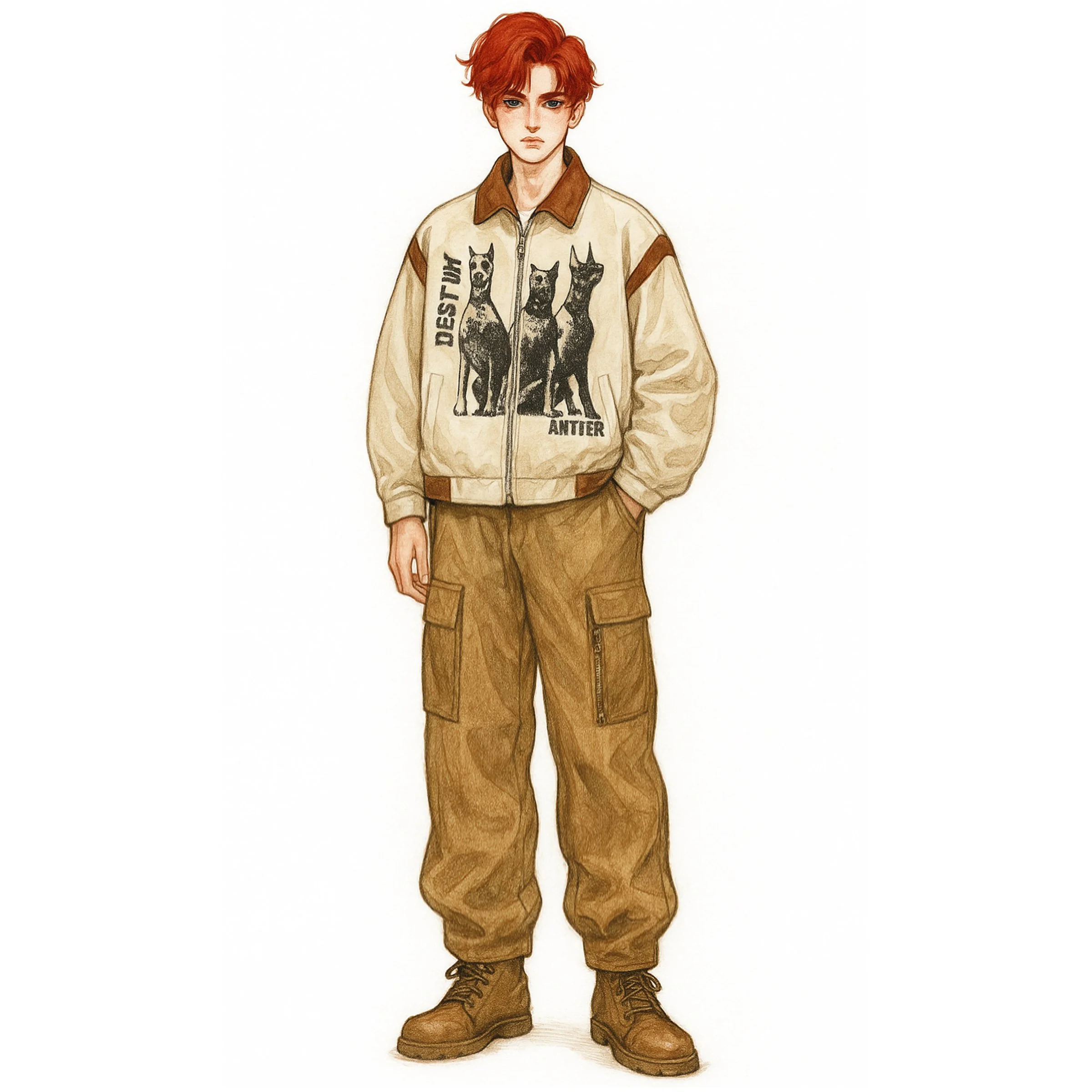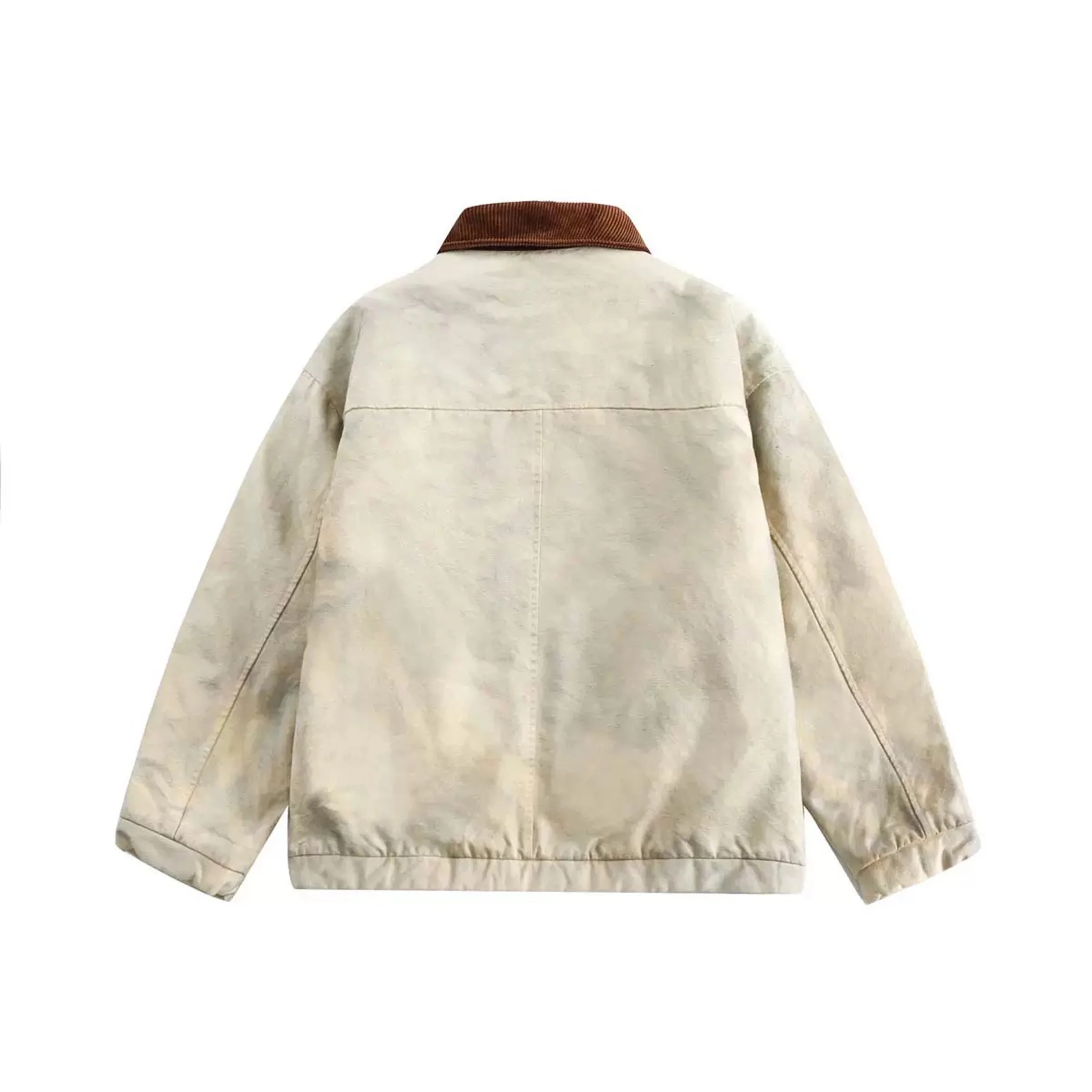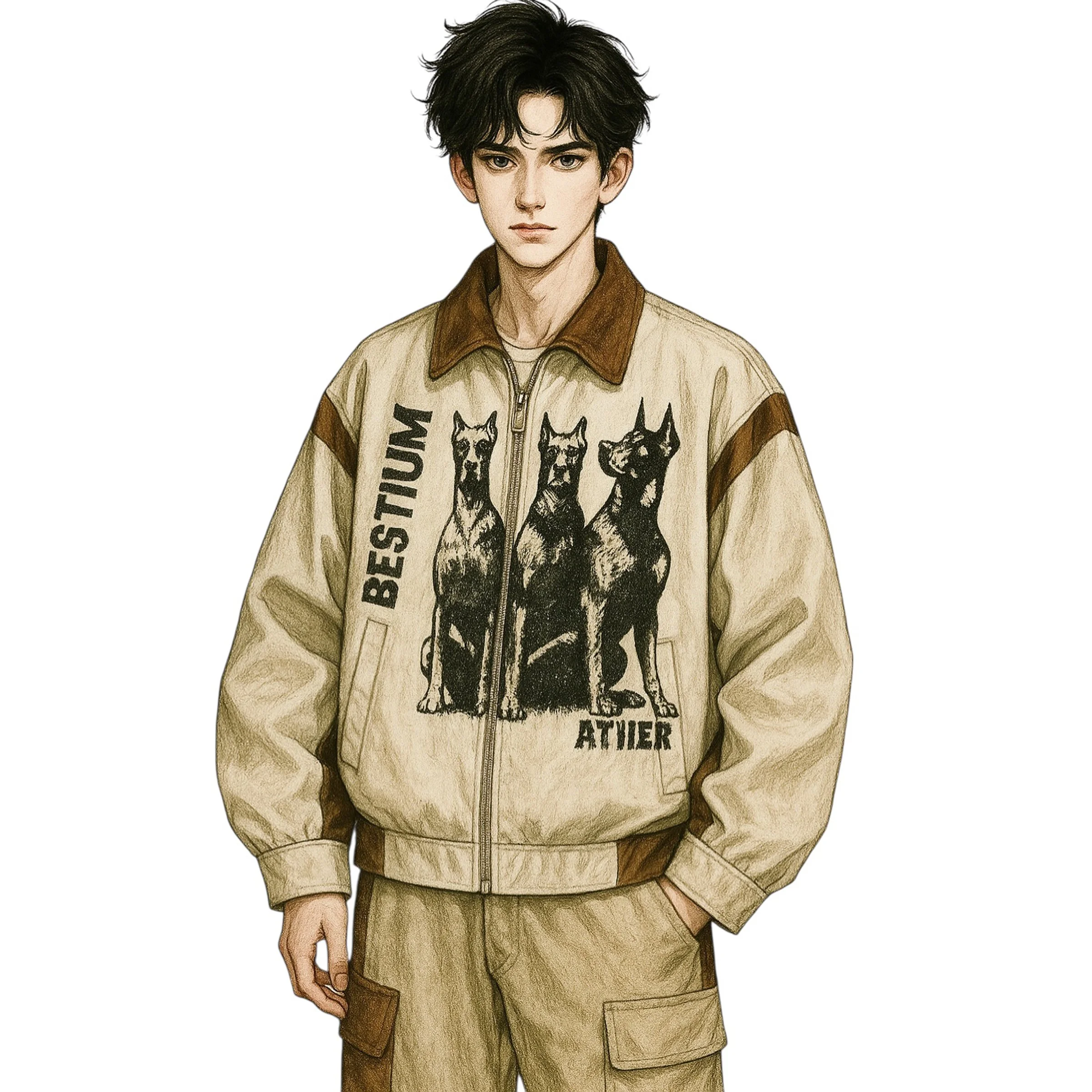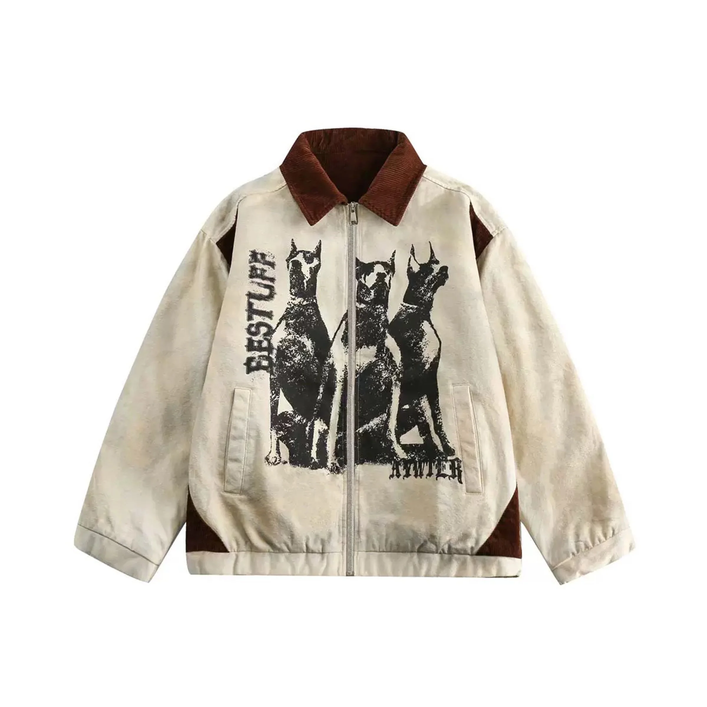 Cerberus Print Corduroy Collar Jacket - Beige Vintage Doberman Graphic Streetwear Coat