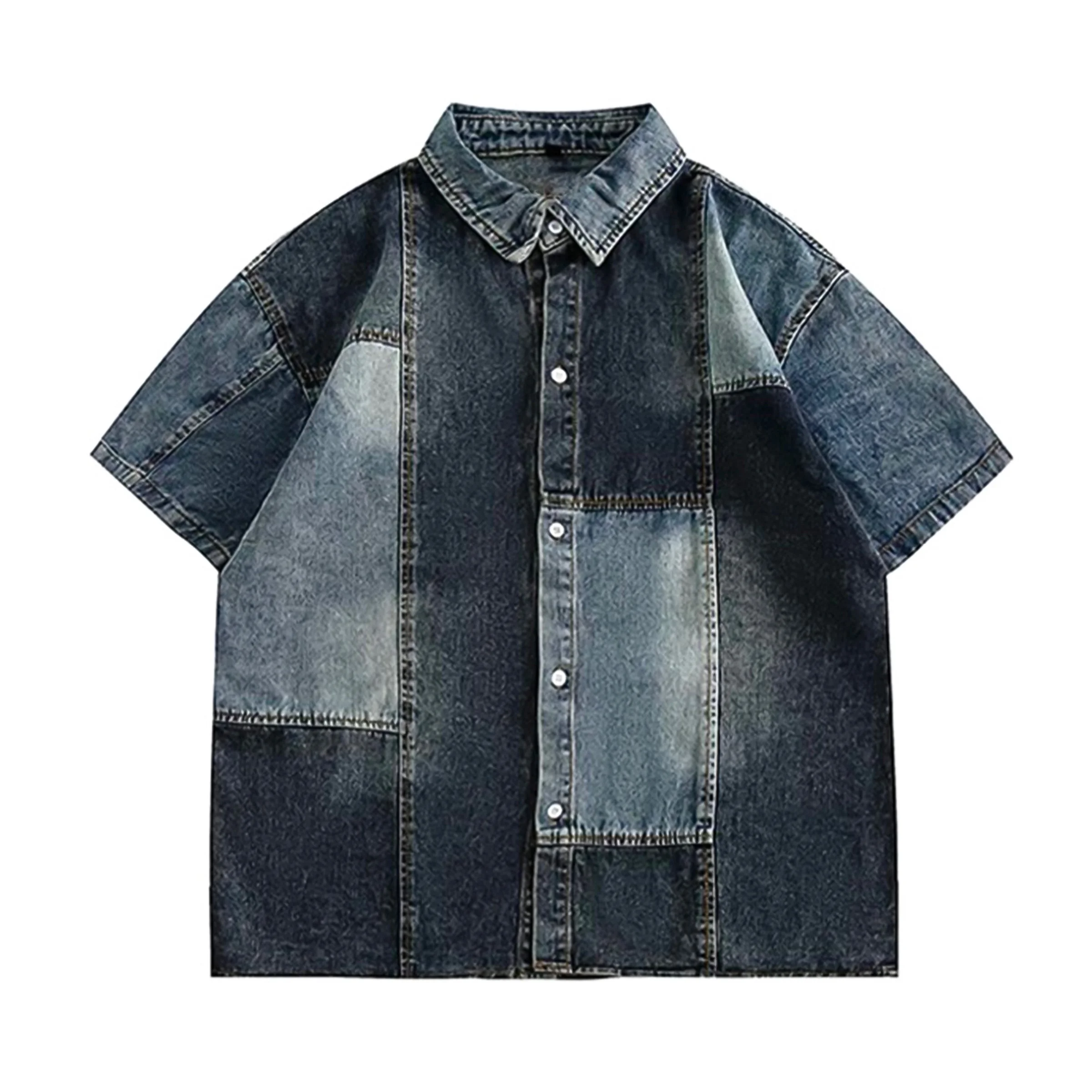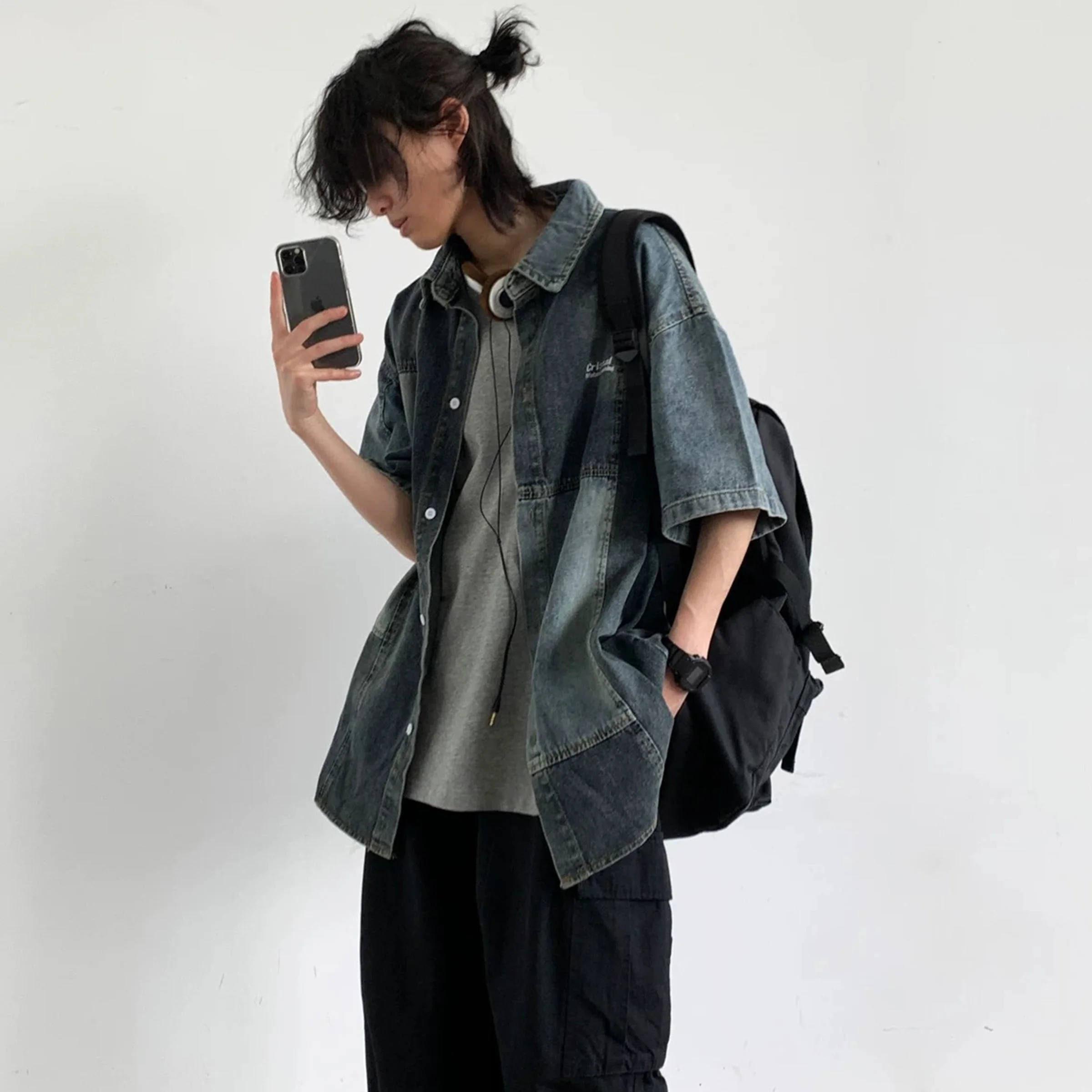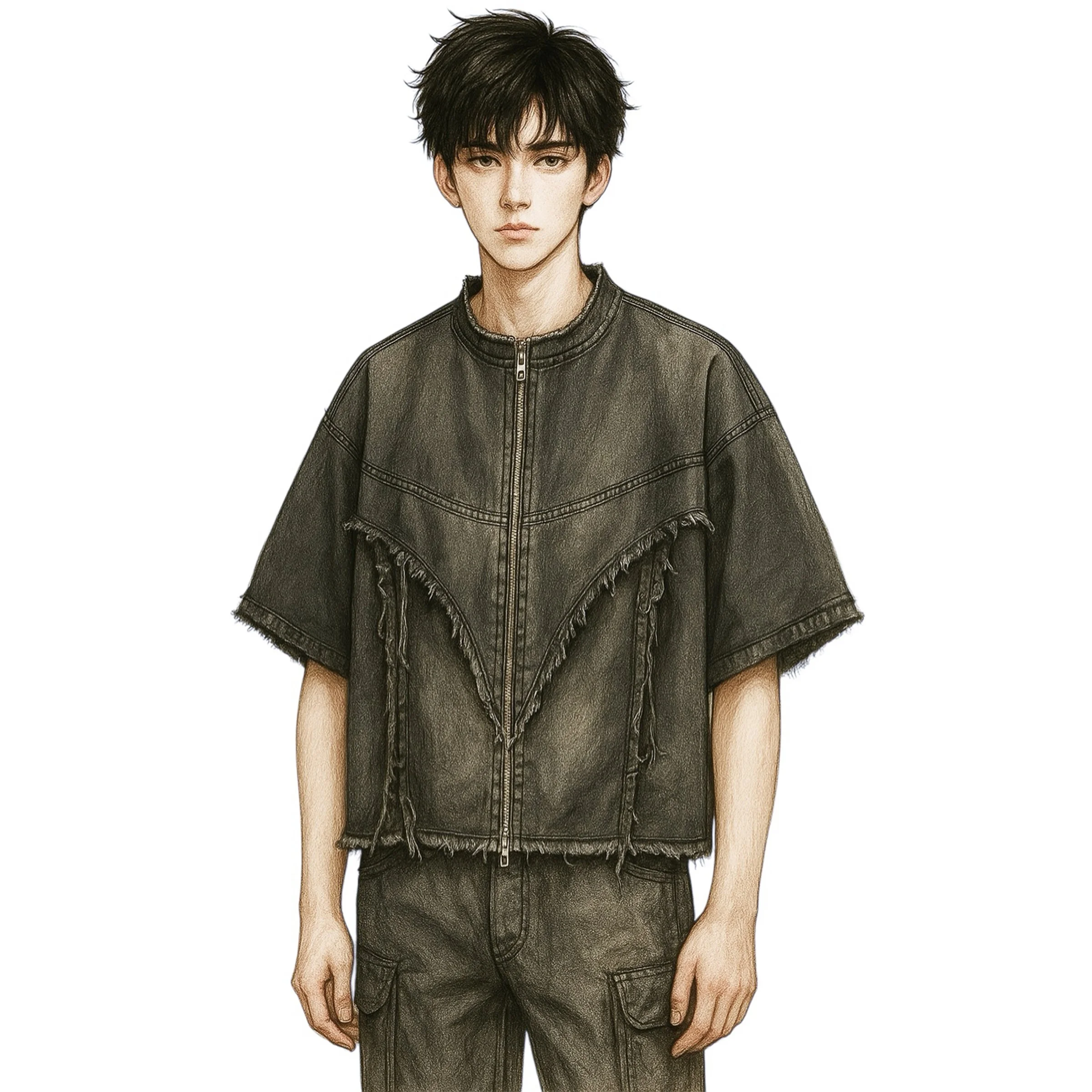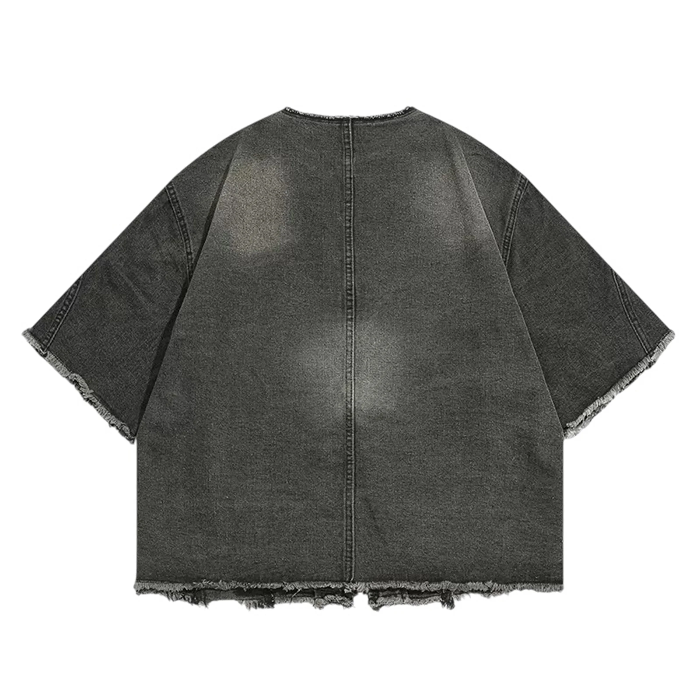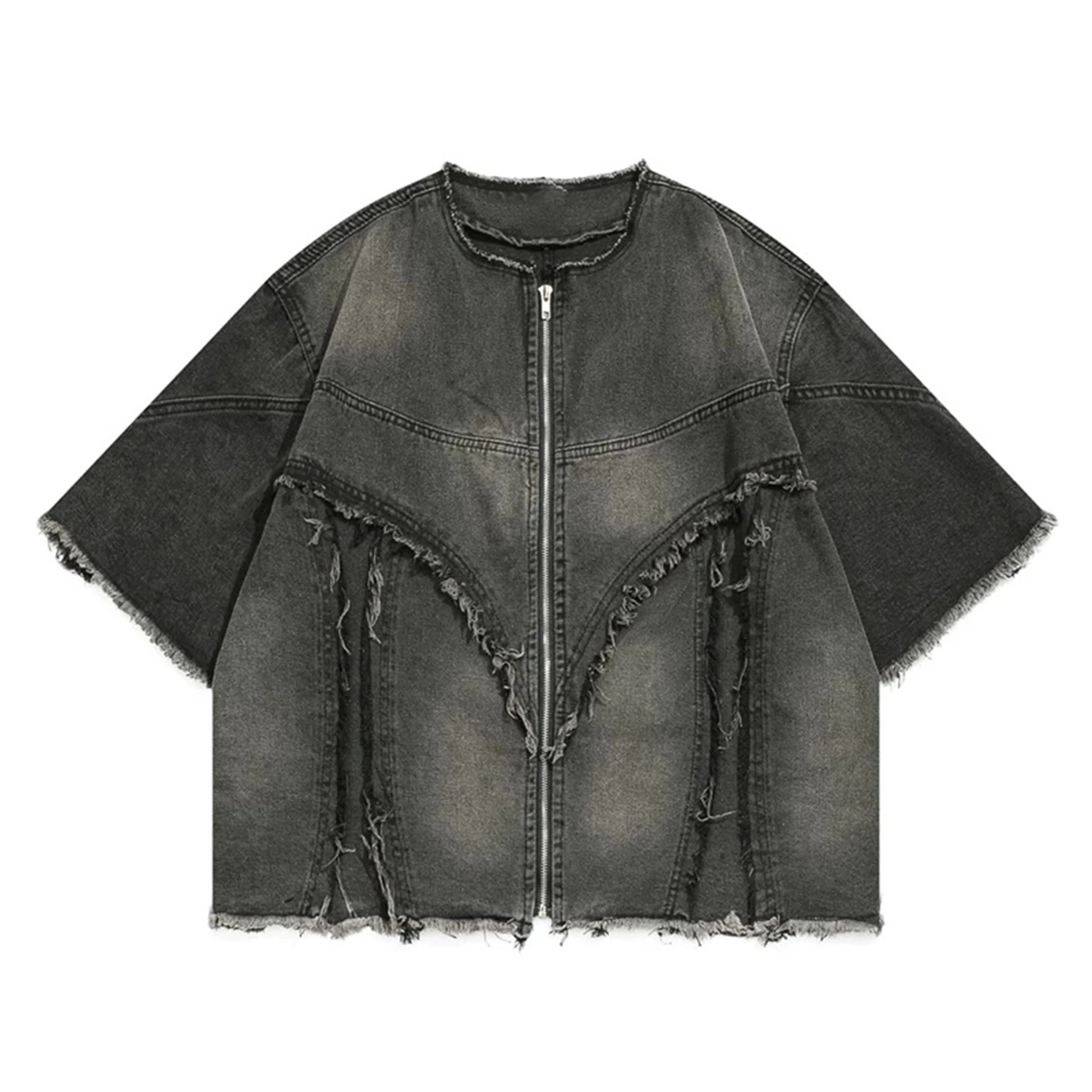 Frayed Short Sleeve Denim Vest Jacket - Grunge Layered Look