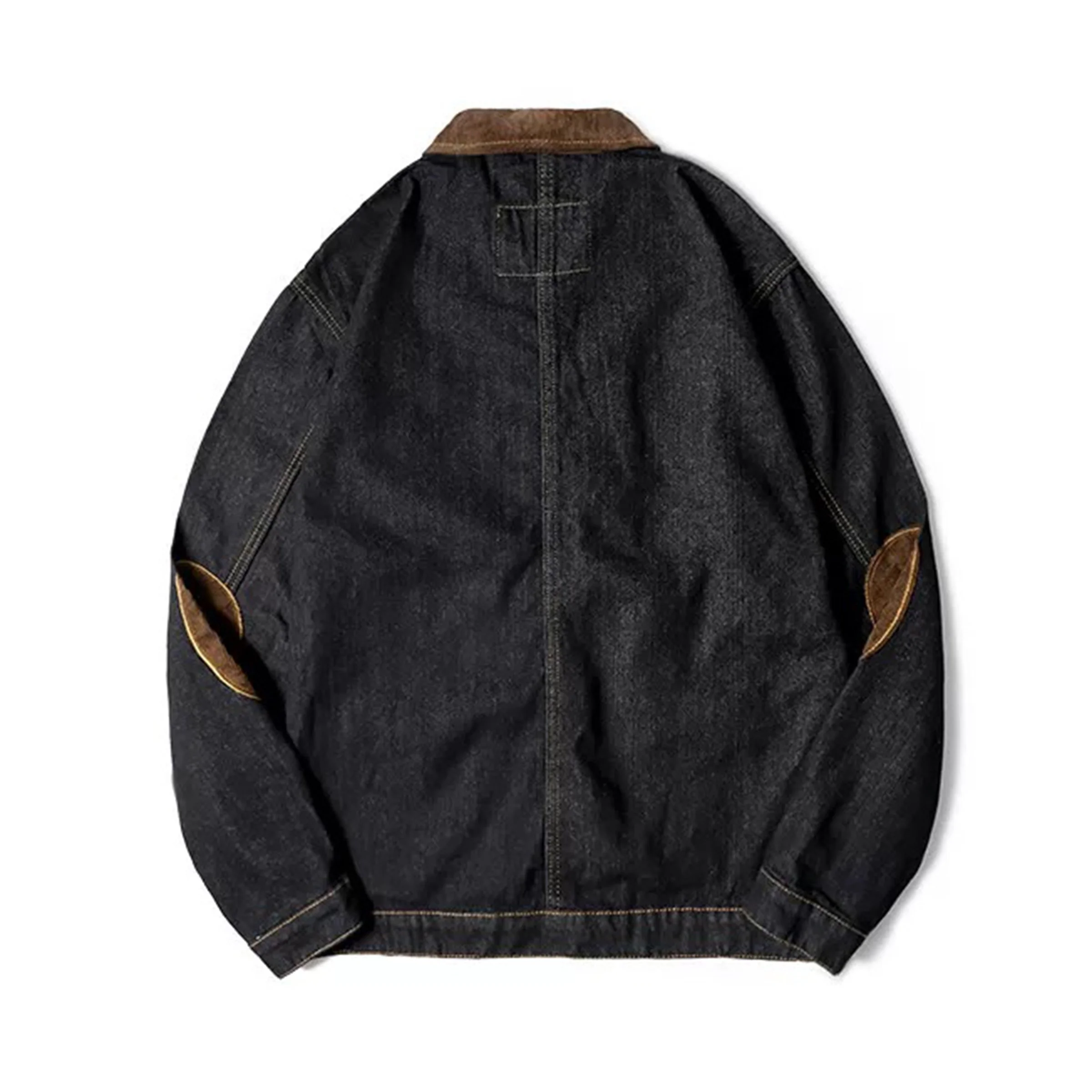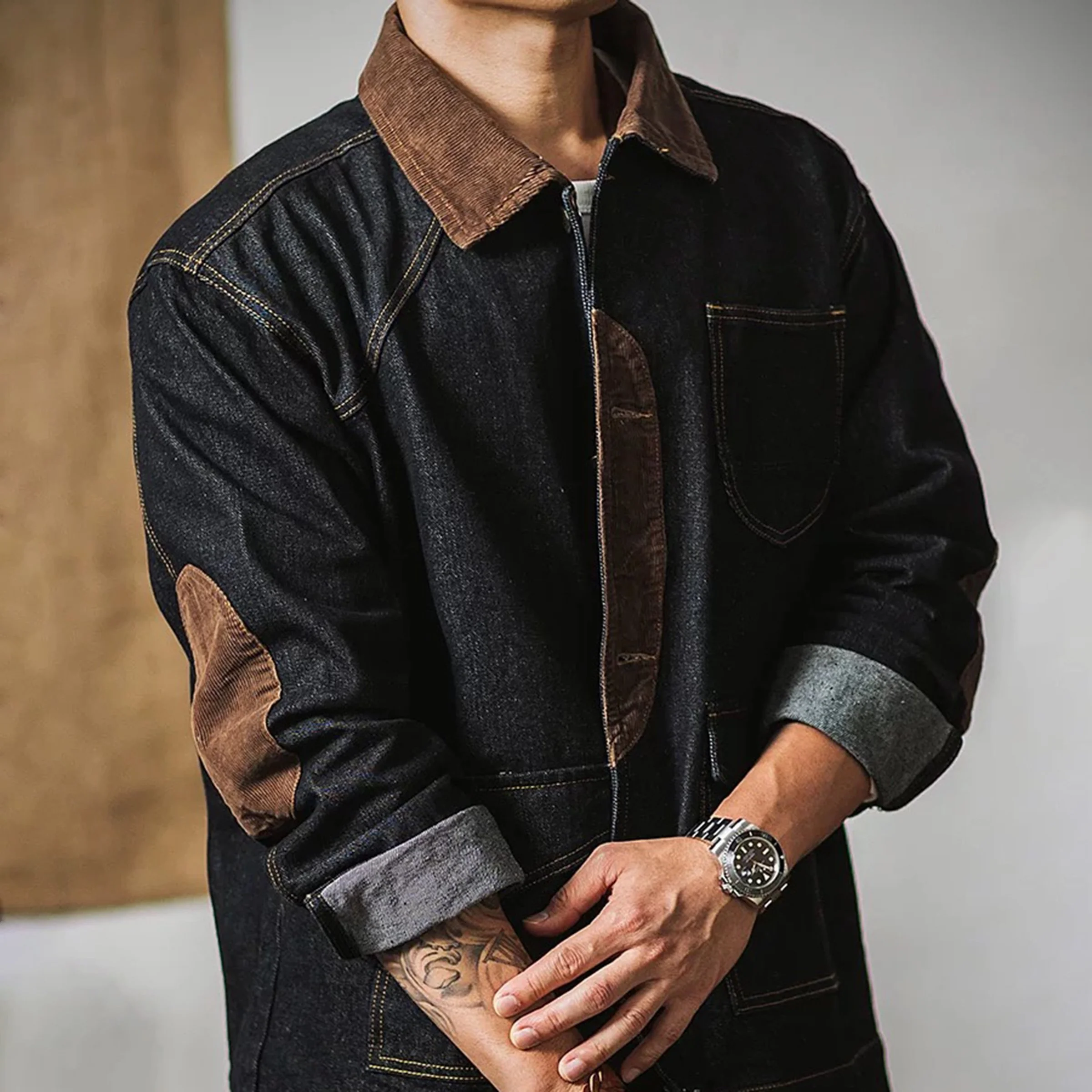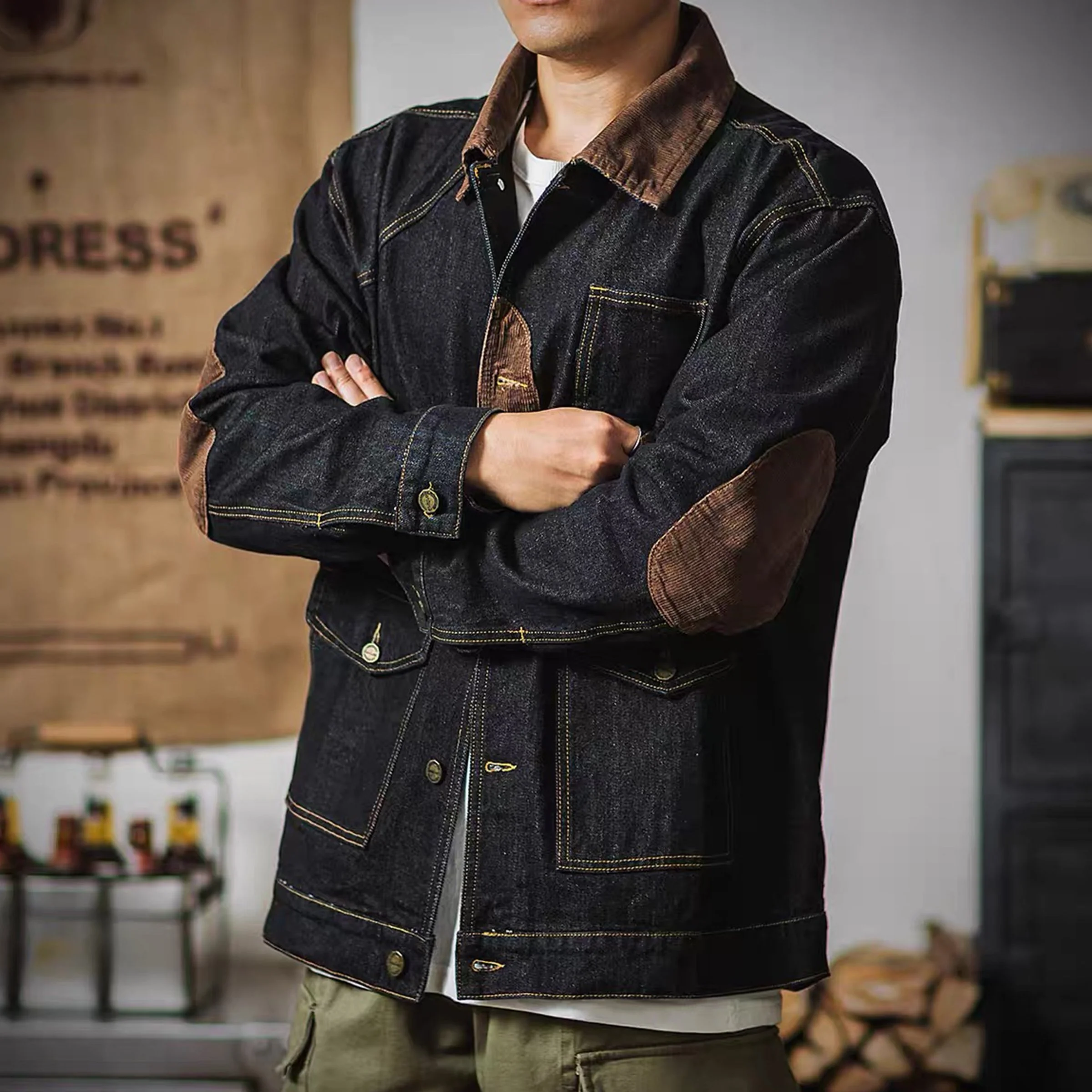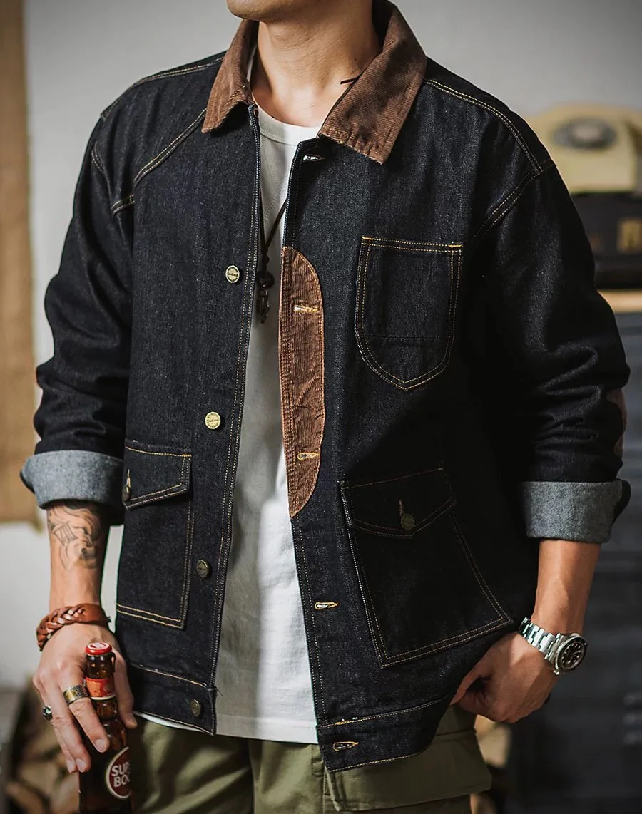 Vintage Workwear Denim Jacket - Dark Wash with Brown Corduroy Trim & Elbow Patches