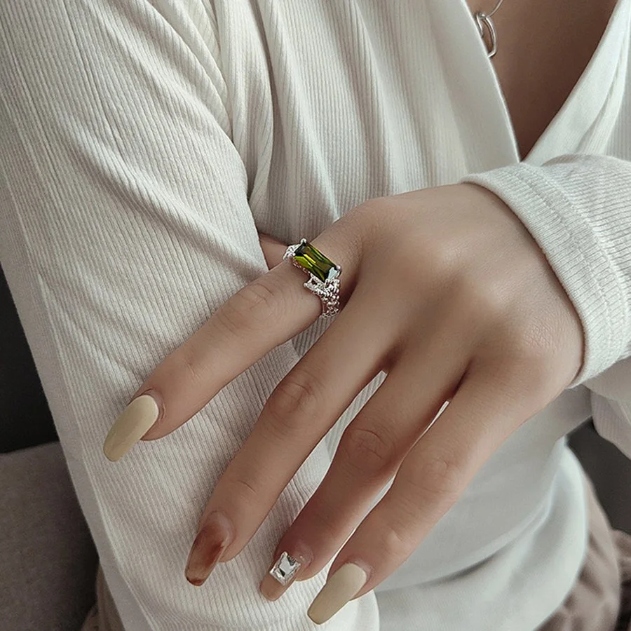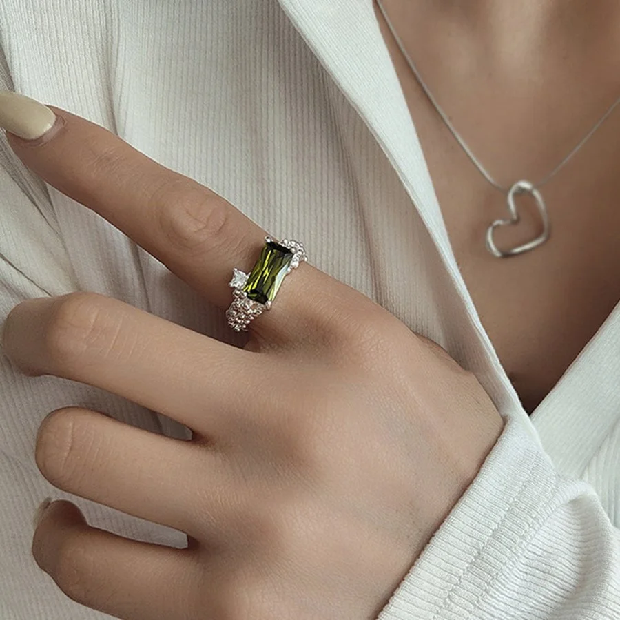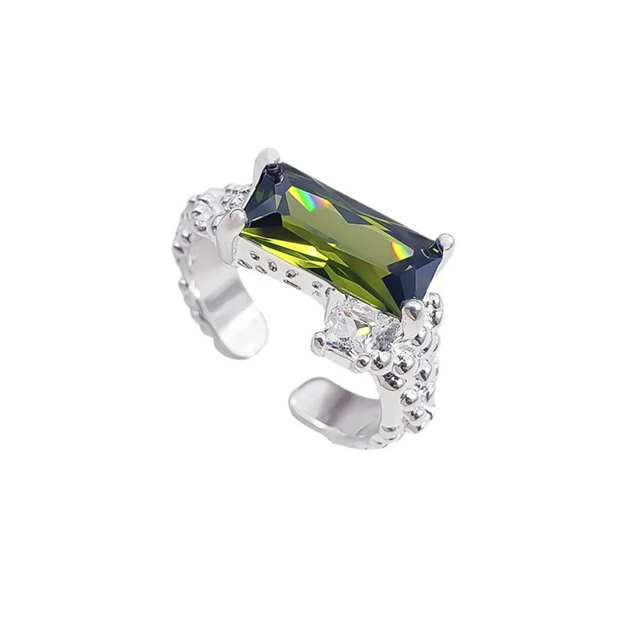 Green Rectangle Crystal 925 Sterling Silver Adjustable Handmade Ring