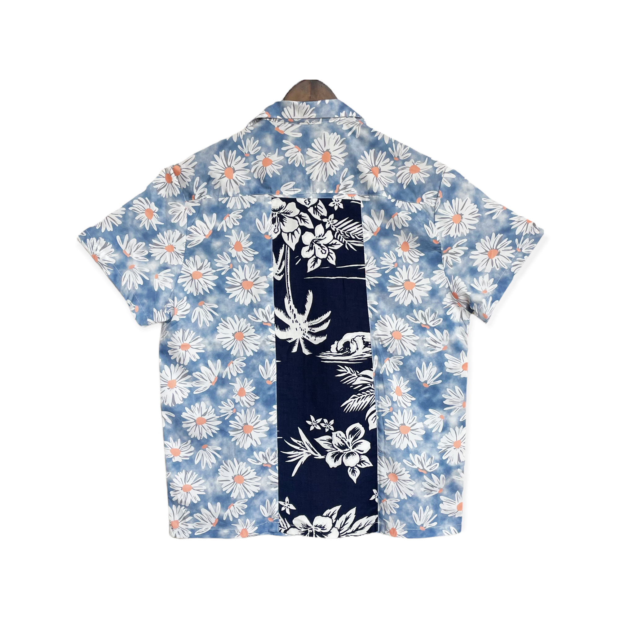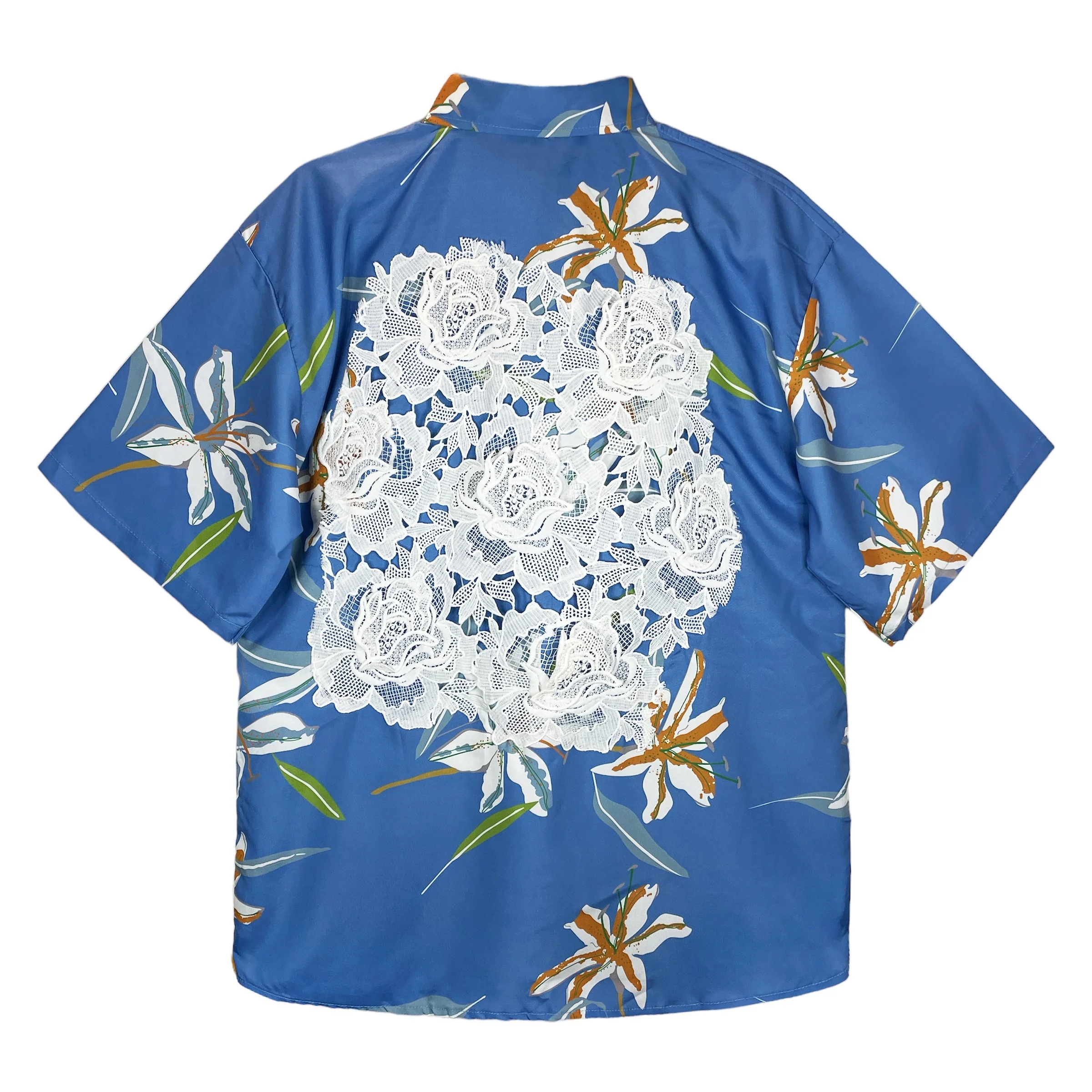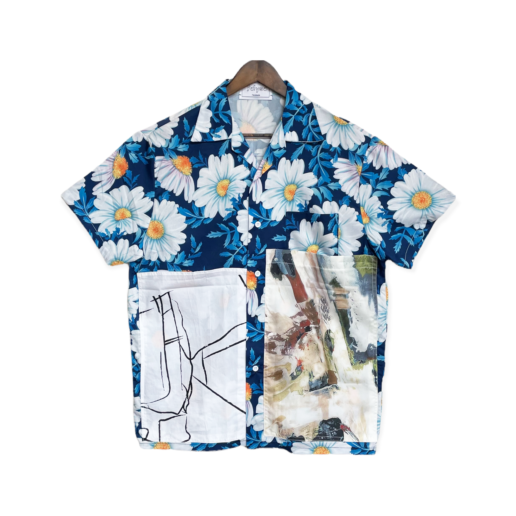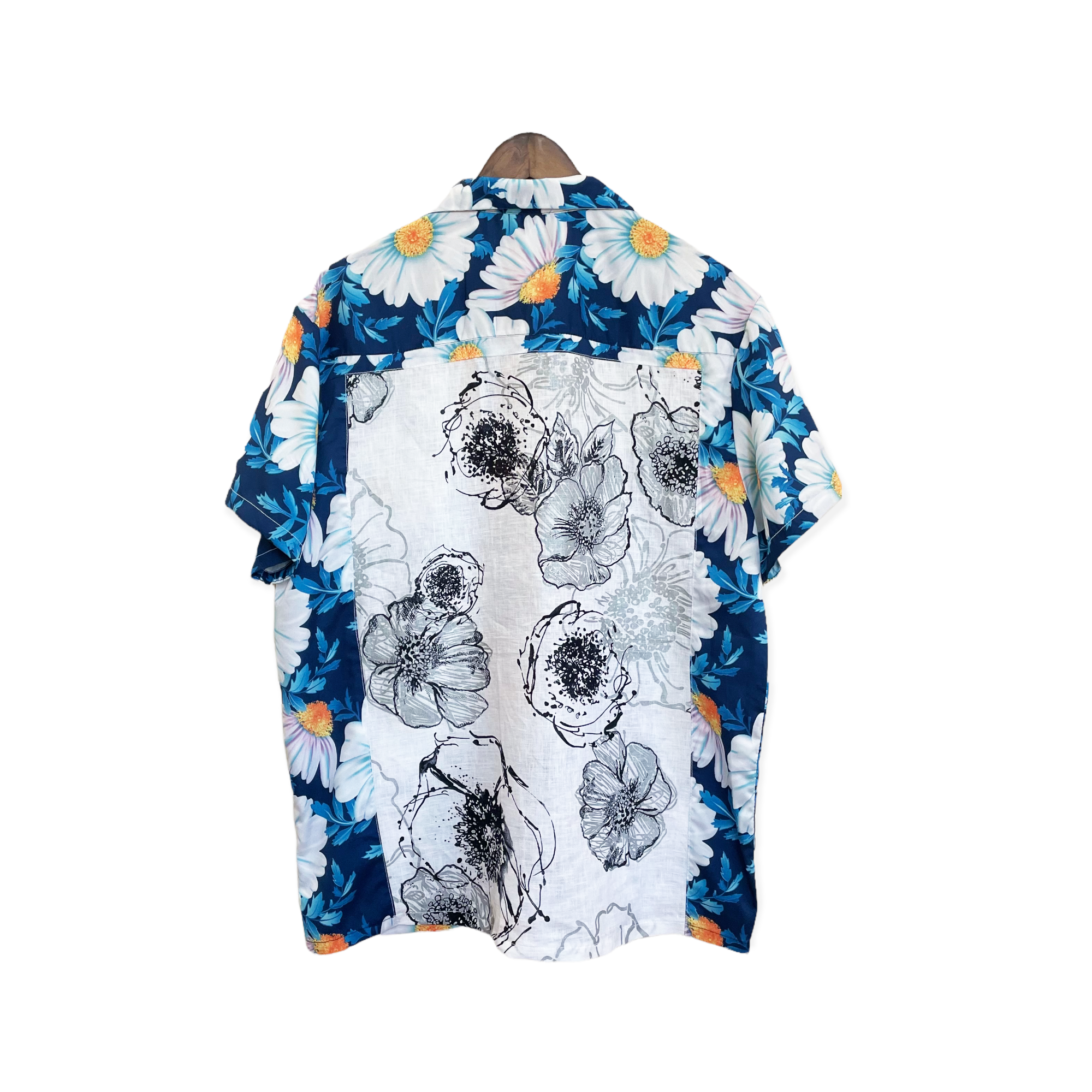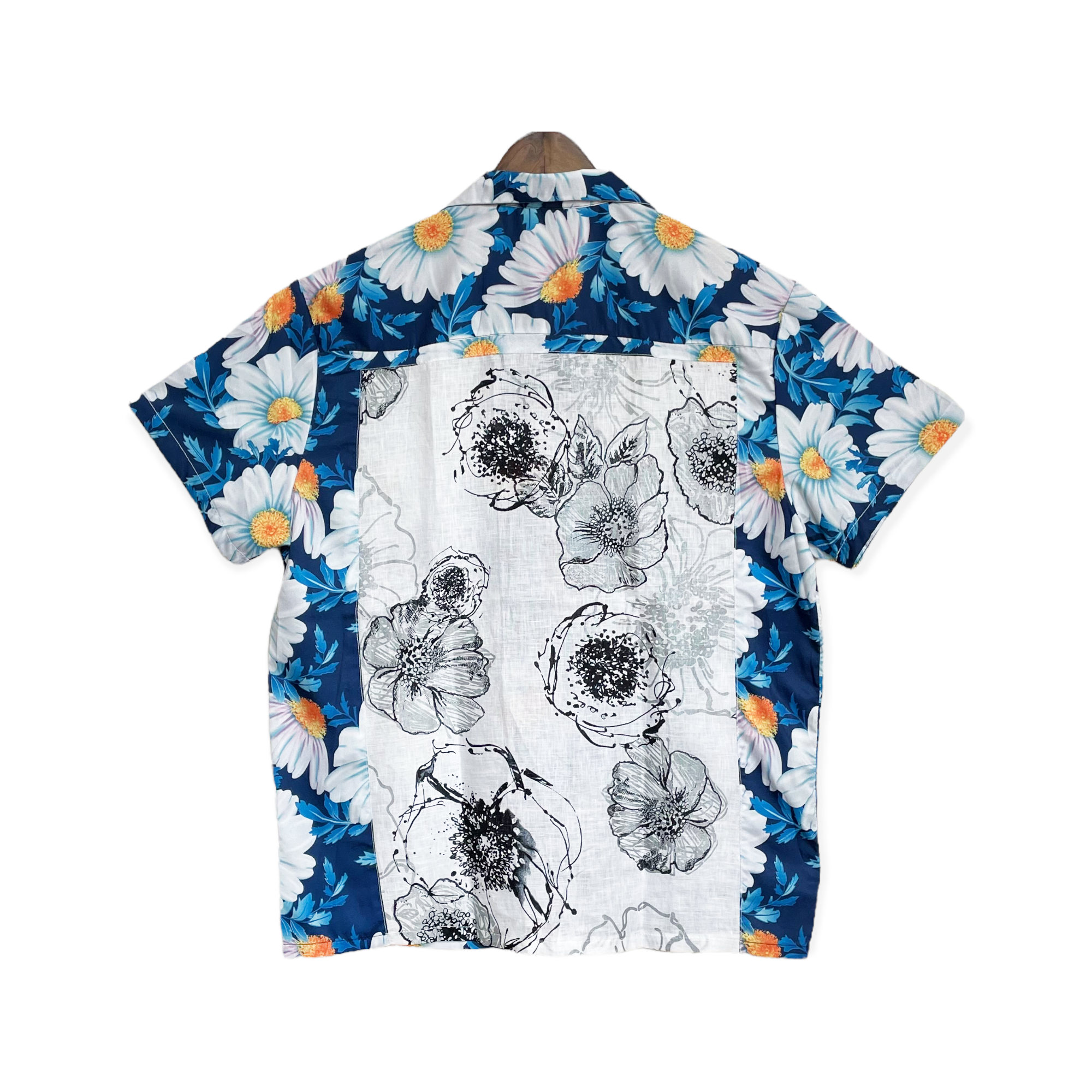 White Flowers Print Short Sleeves Handmade Blue Shirt