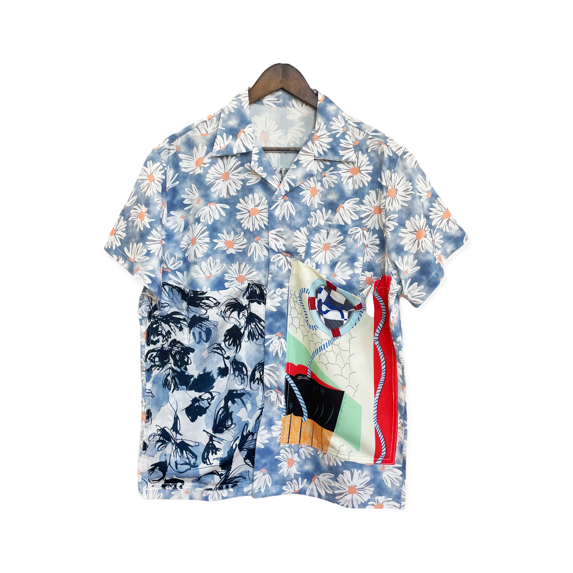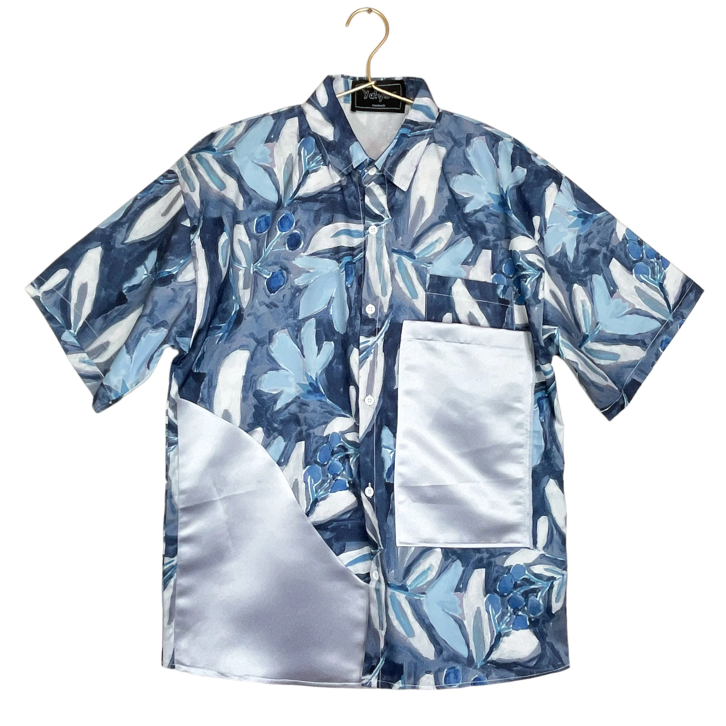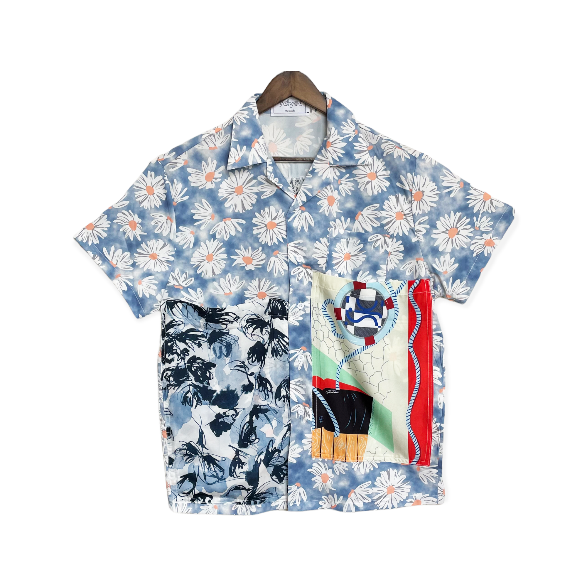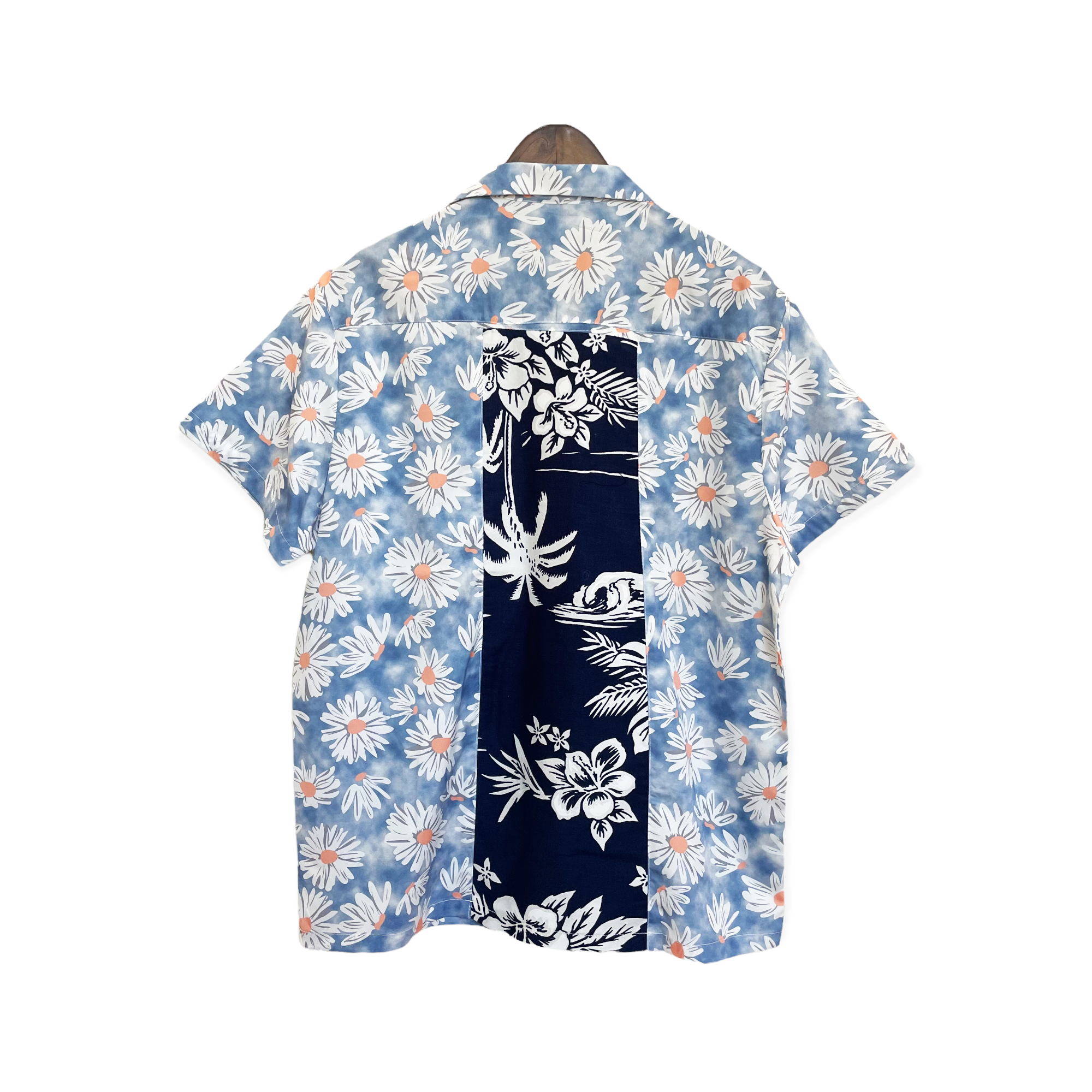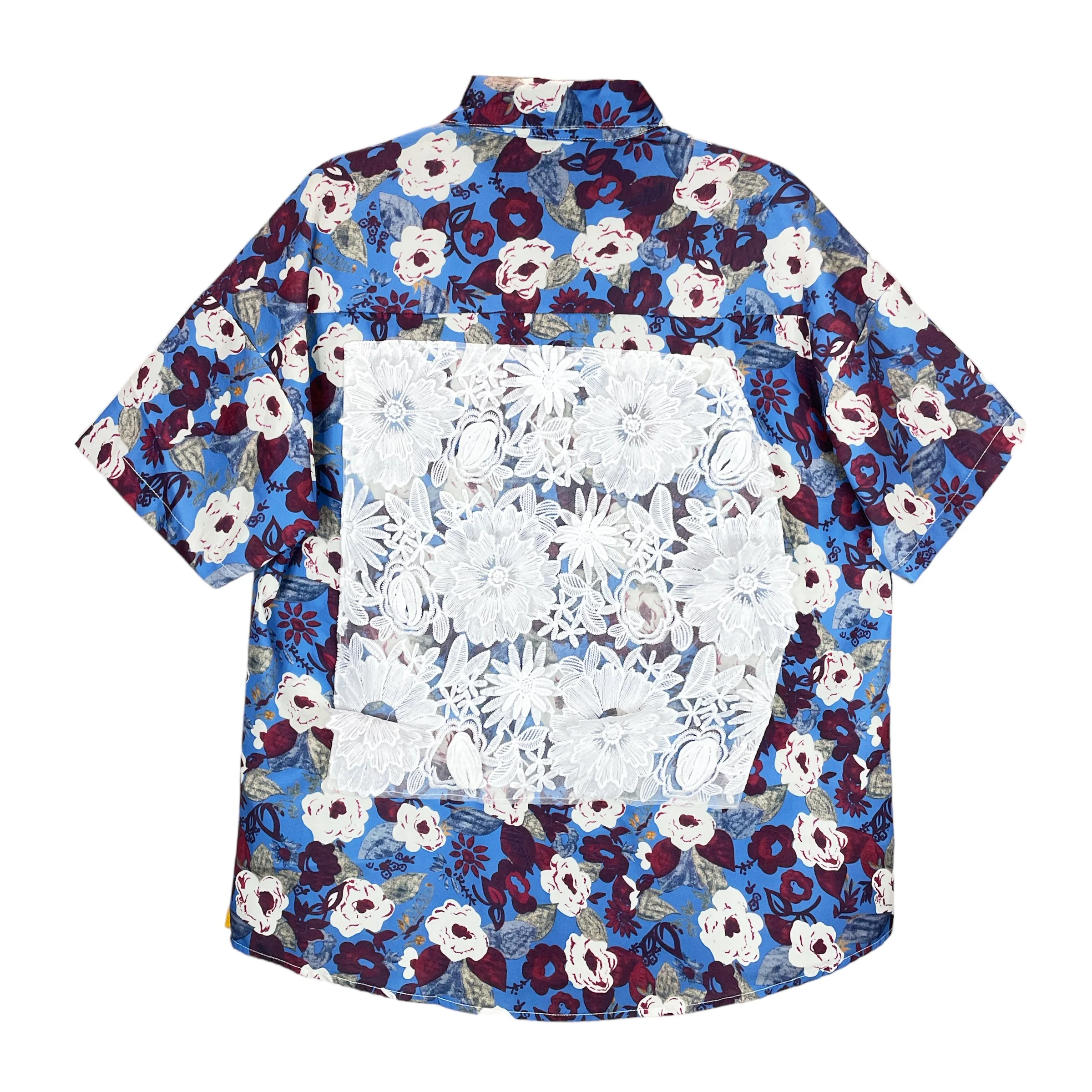 White Flowers Print Short Sleeves Handmade Blue Shirt