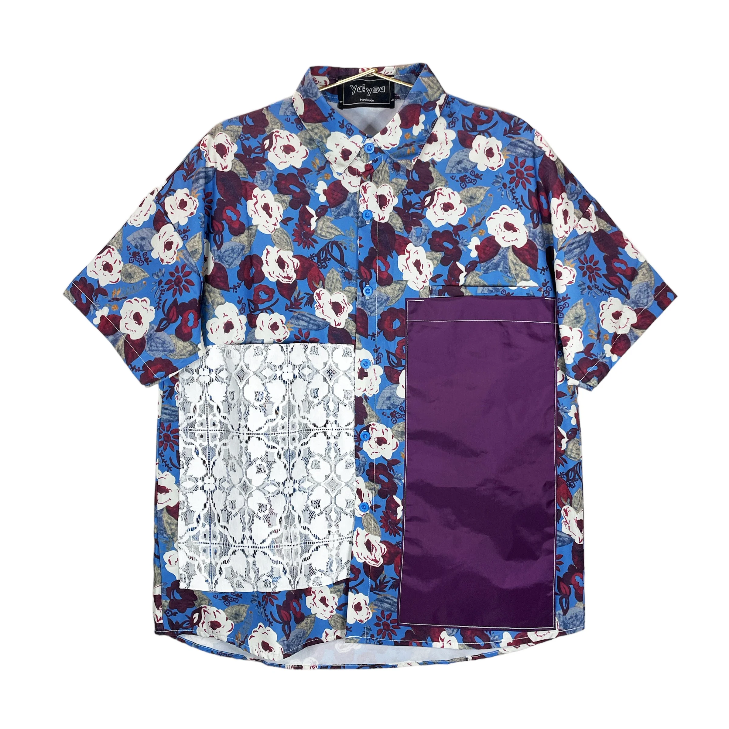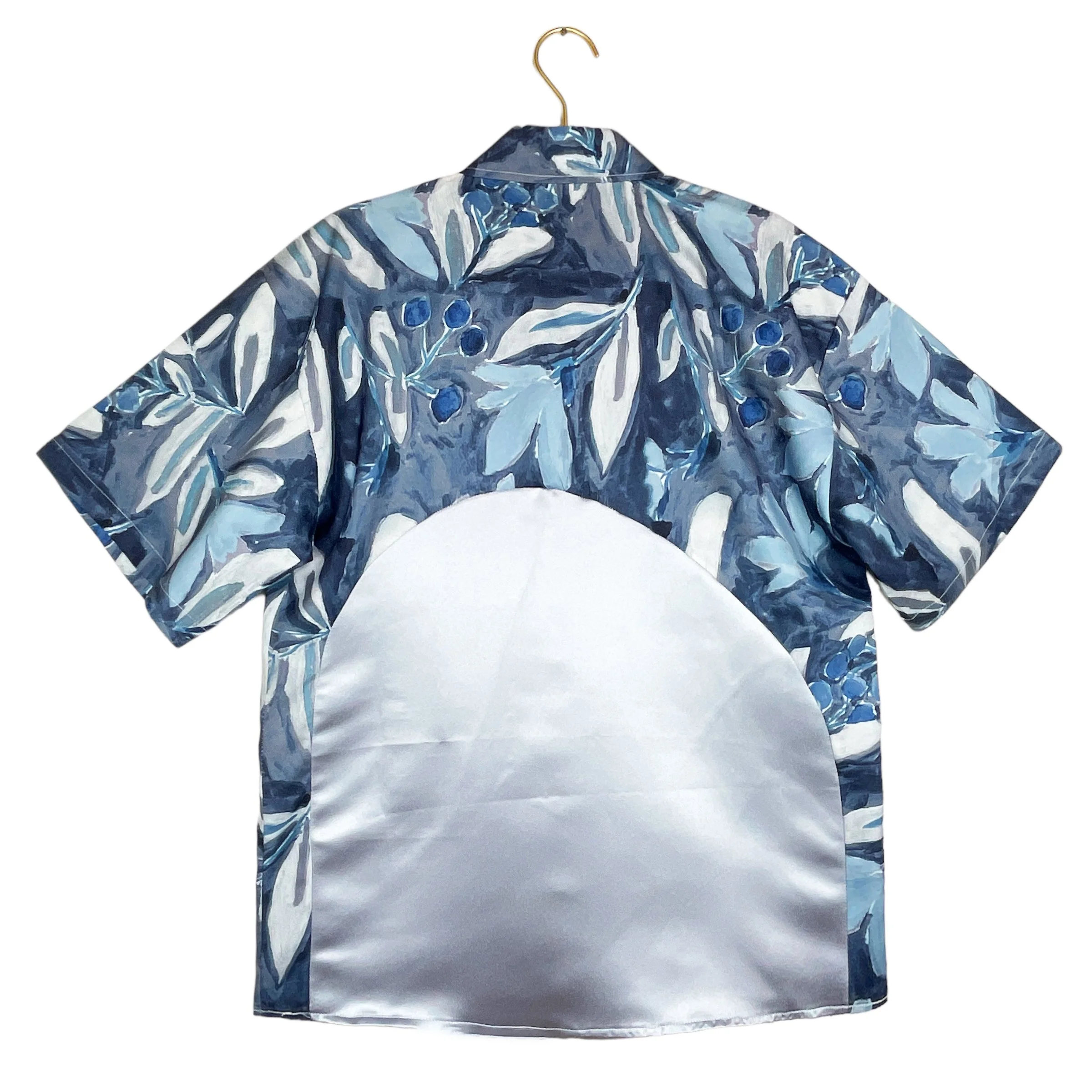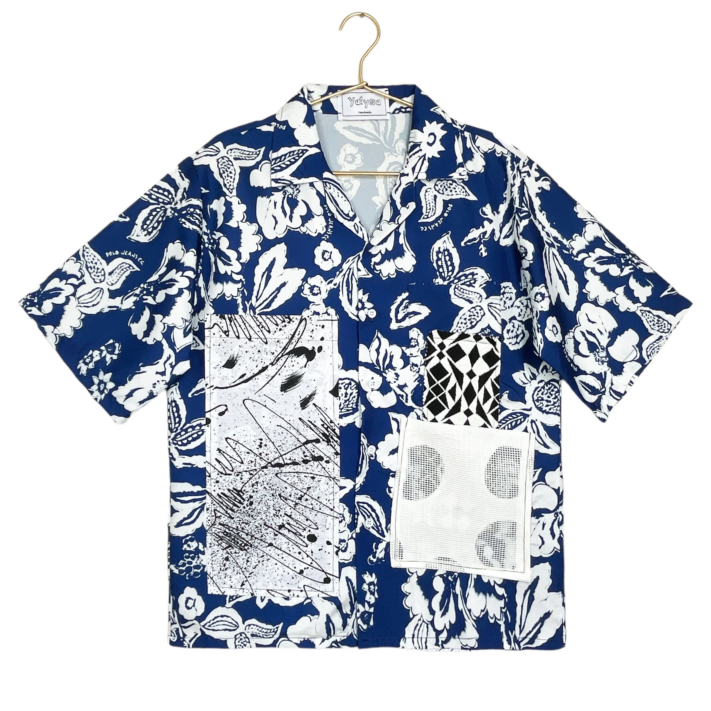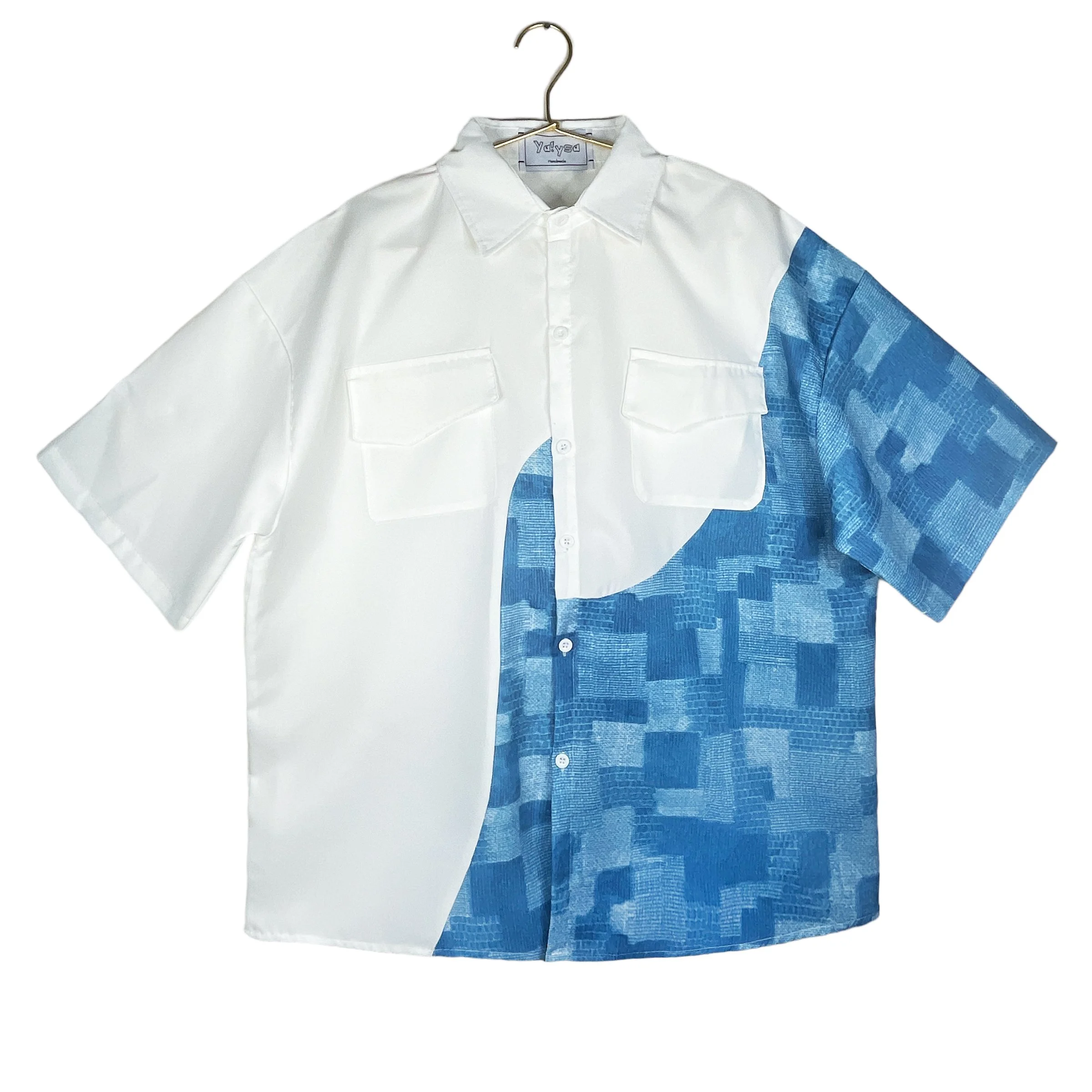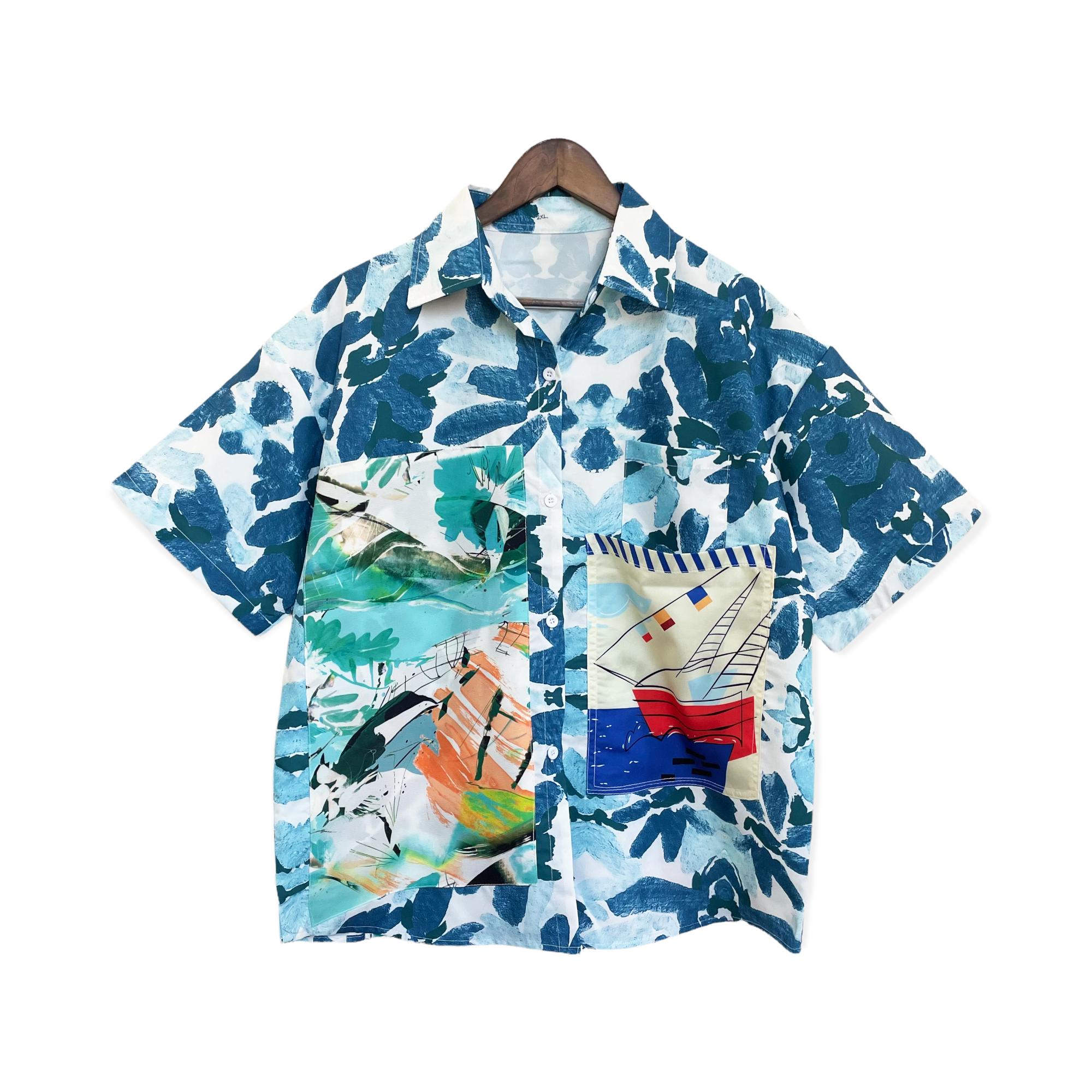 White Flowers Print Short Sleeves Handmade Blue Shirt