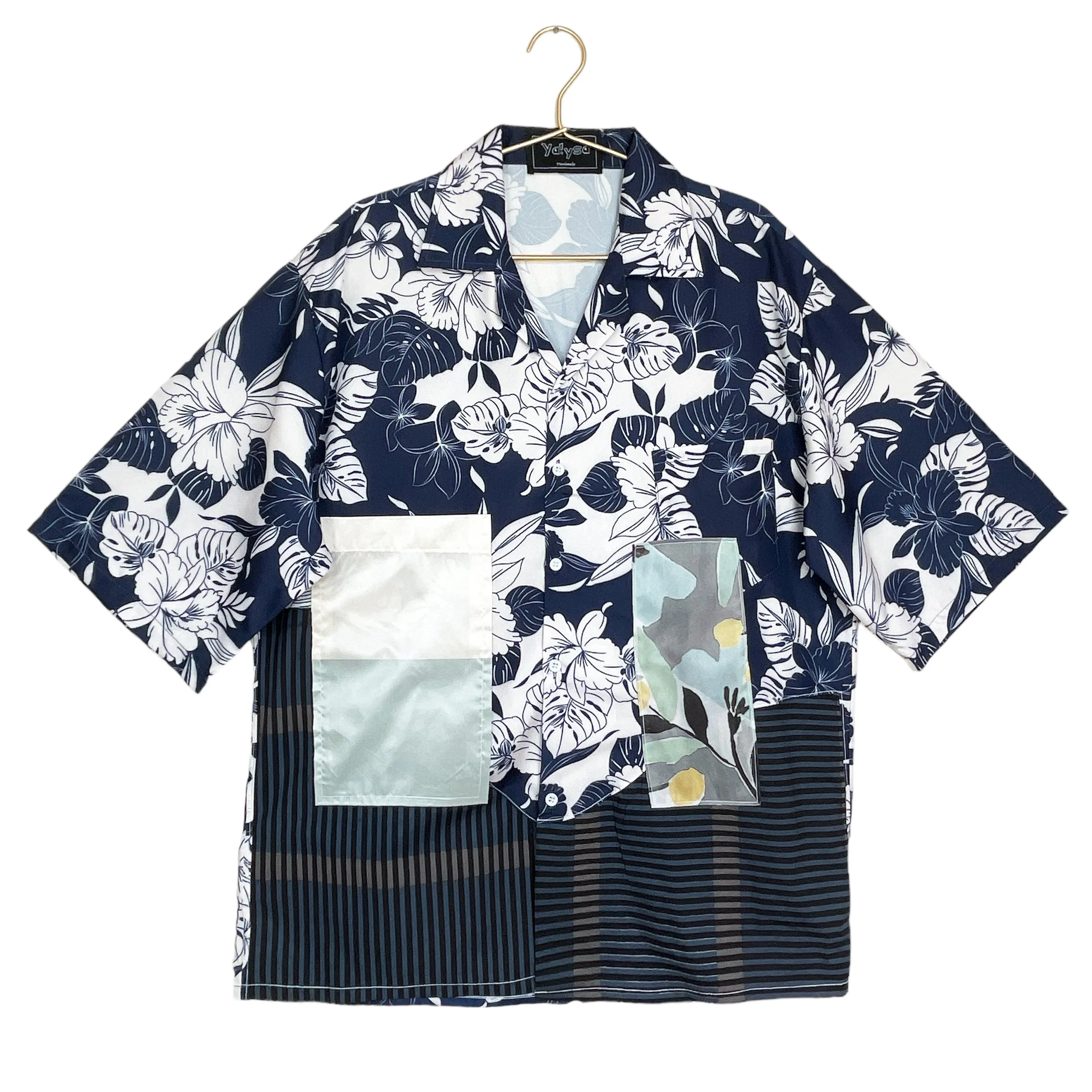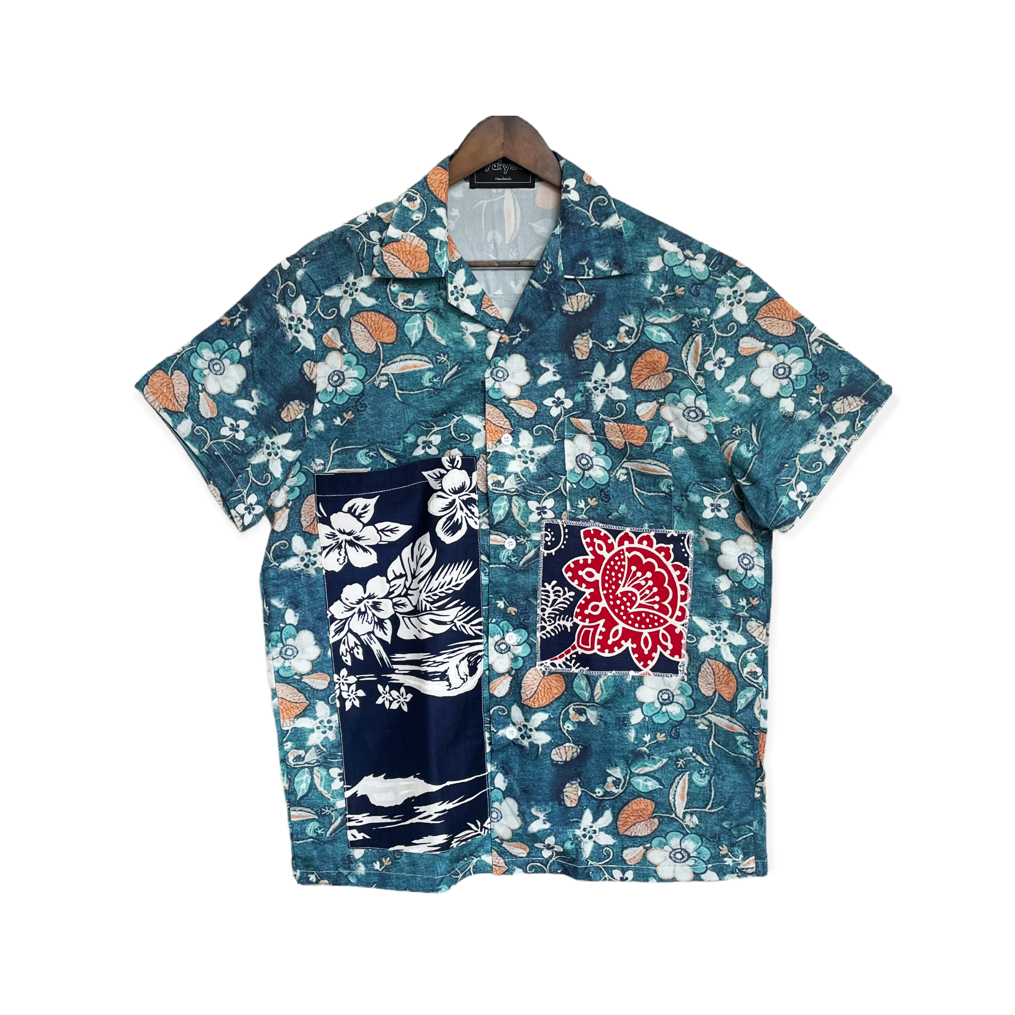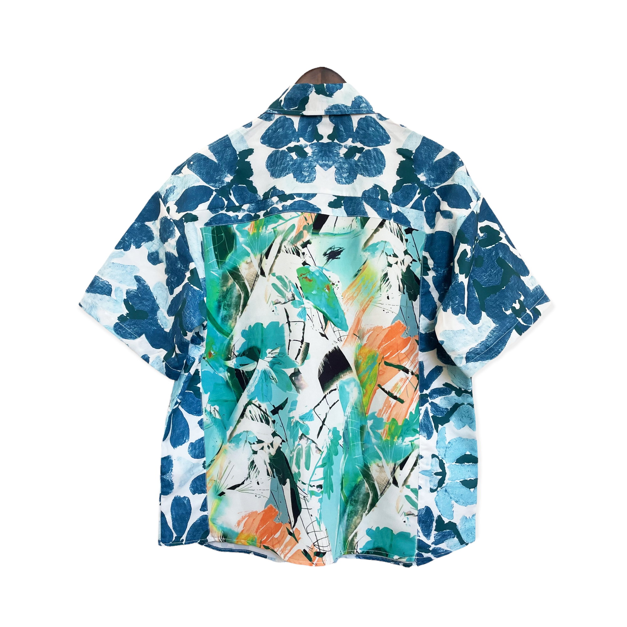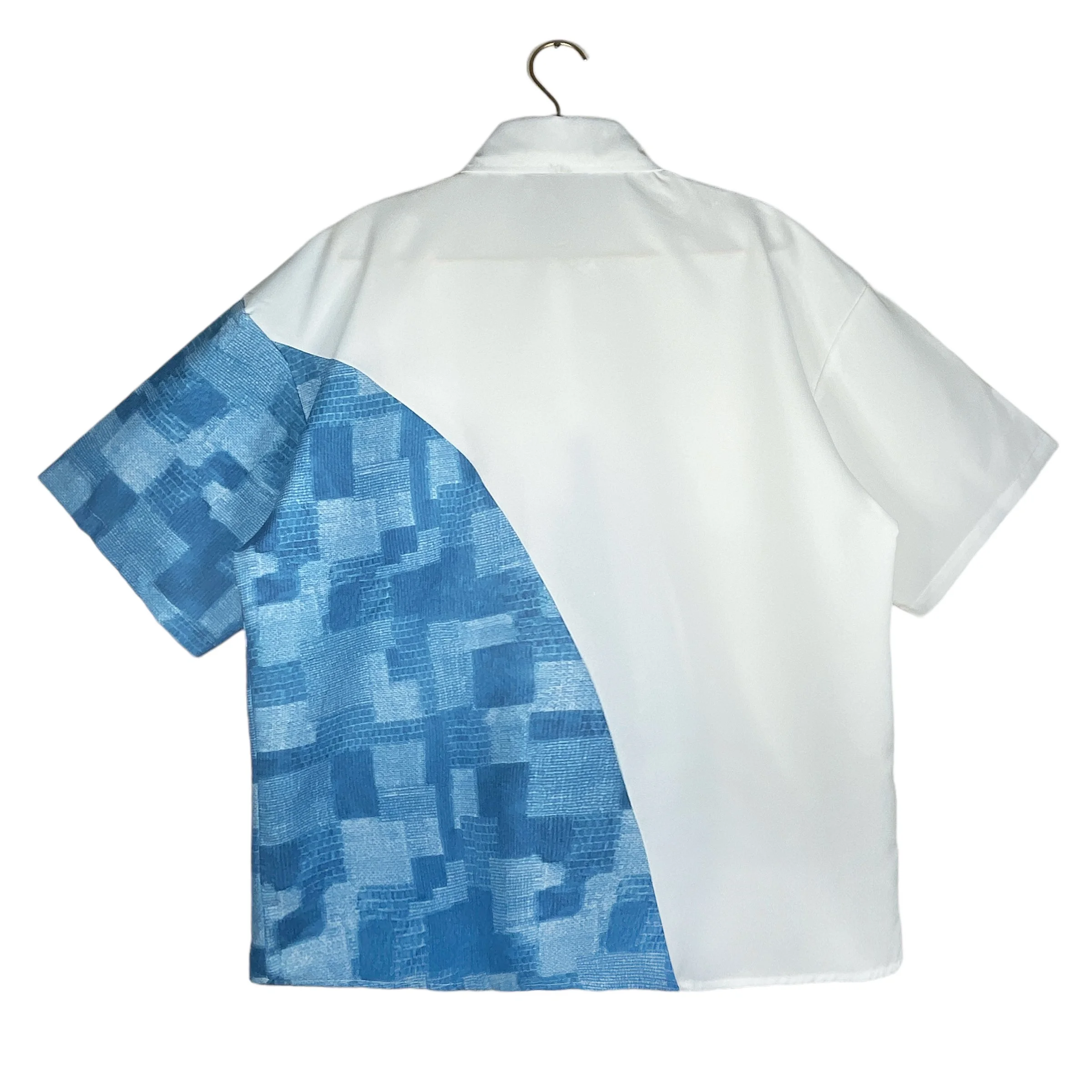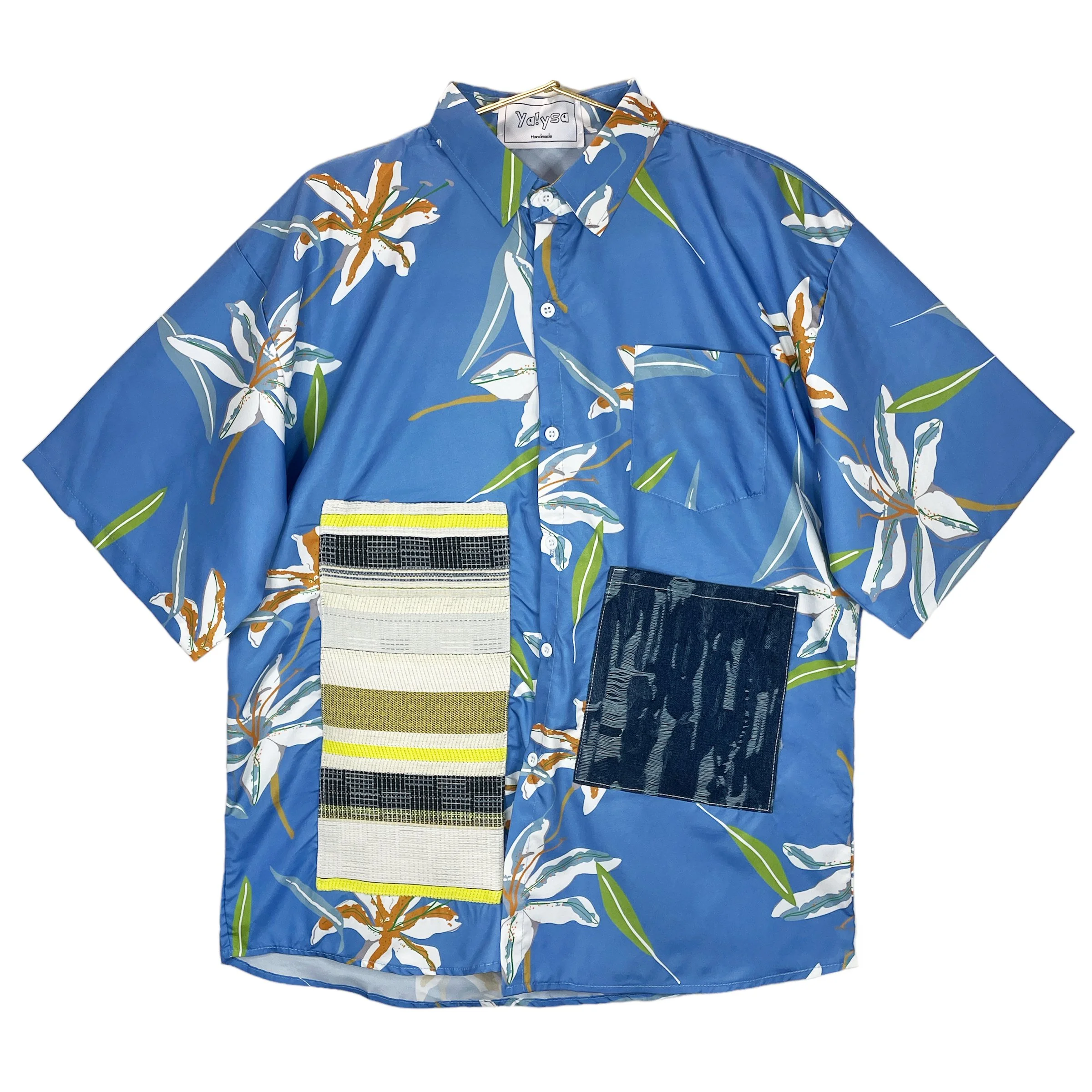 White Flowers Print Short Sleeves Handmade Blue Shirt