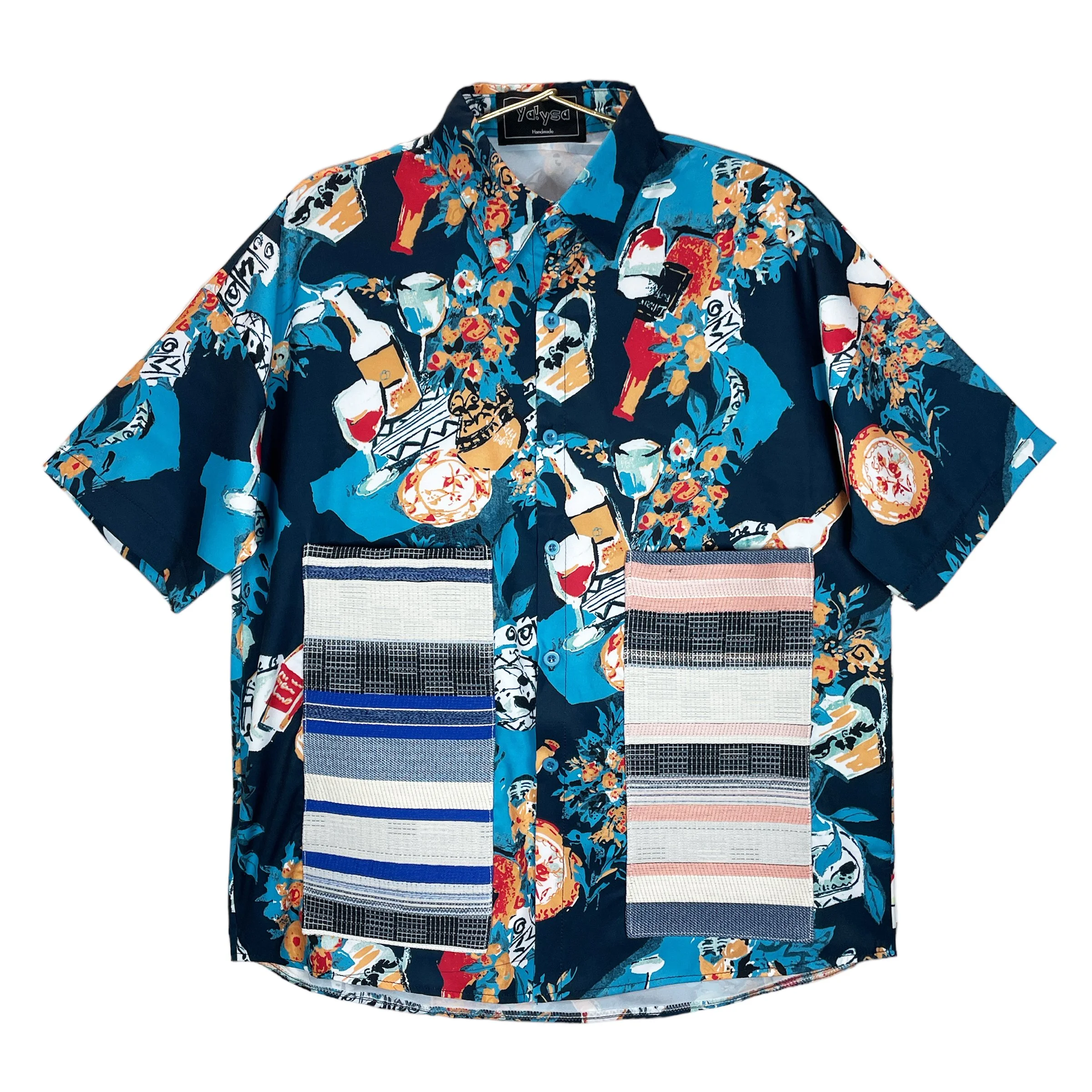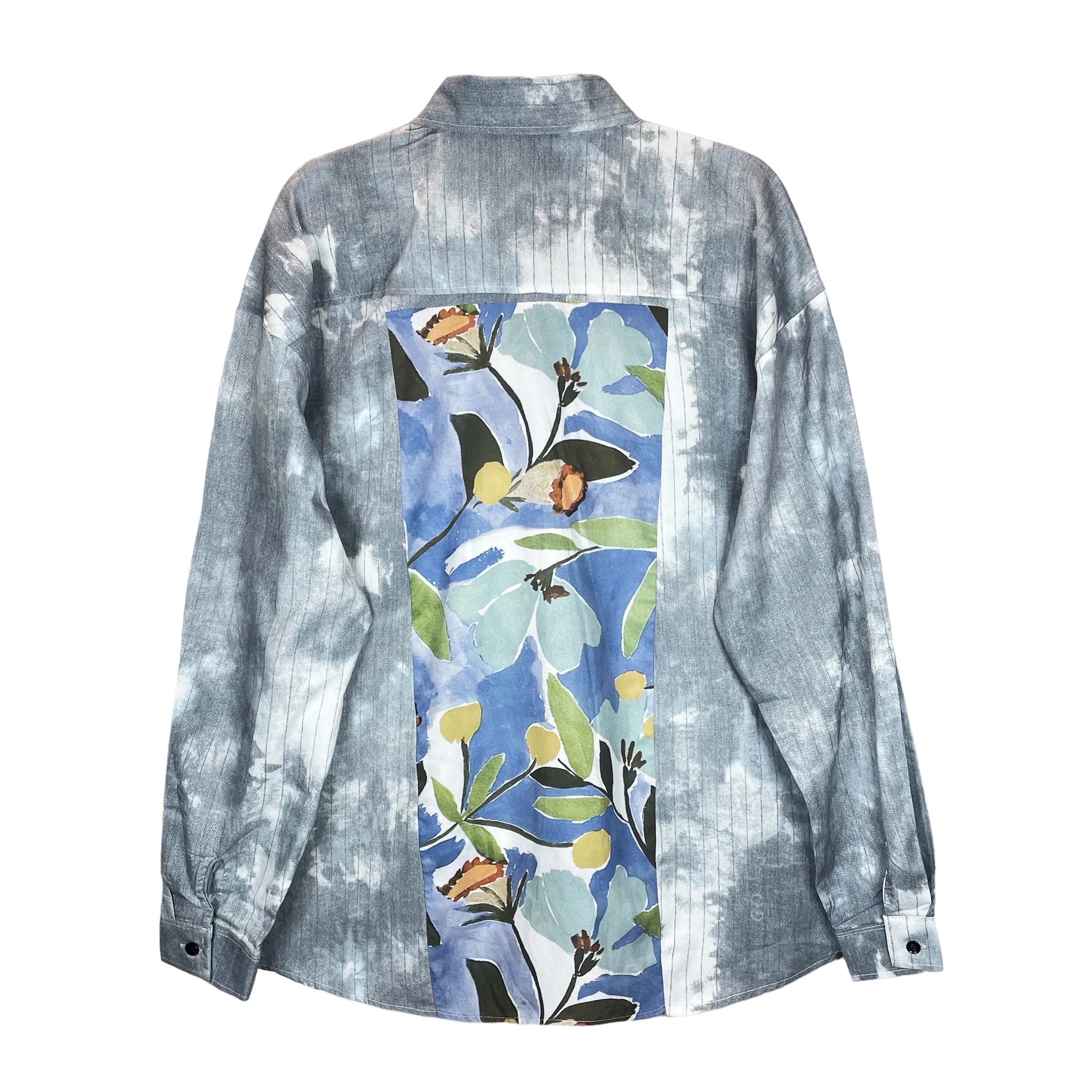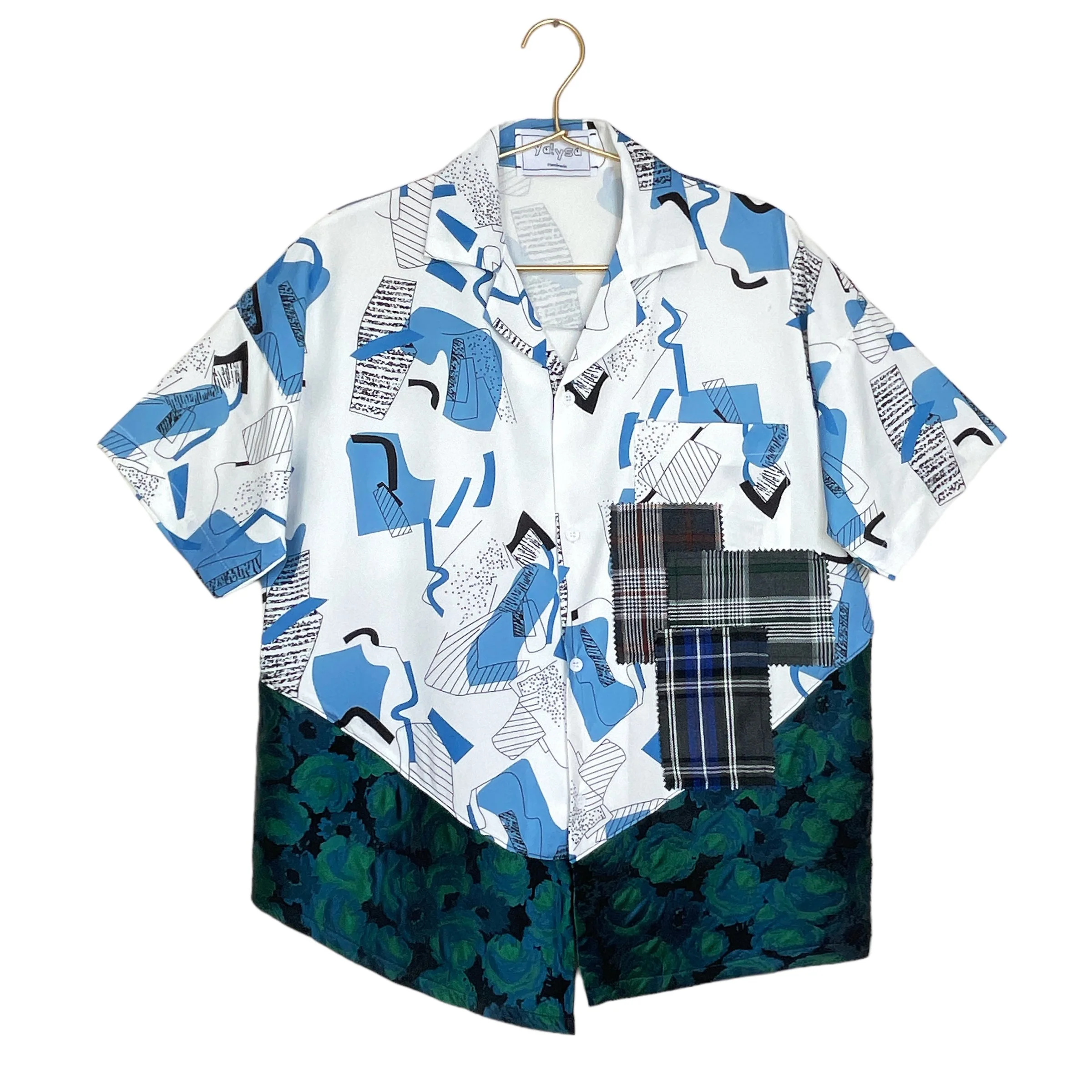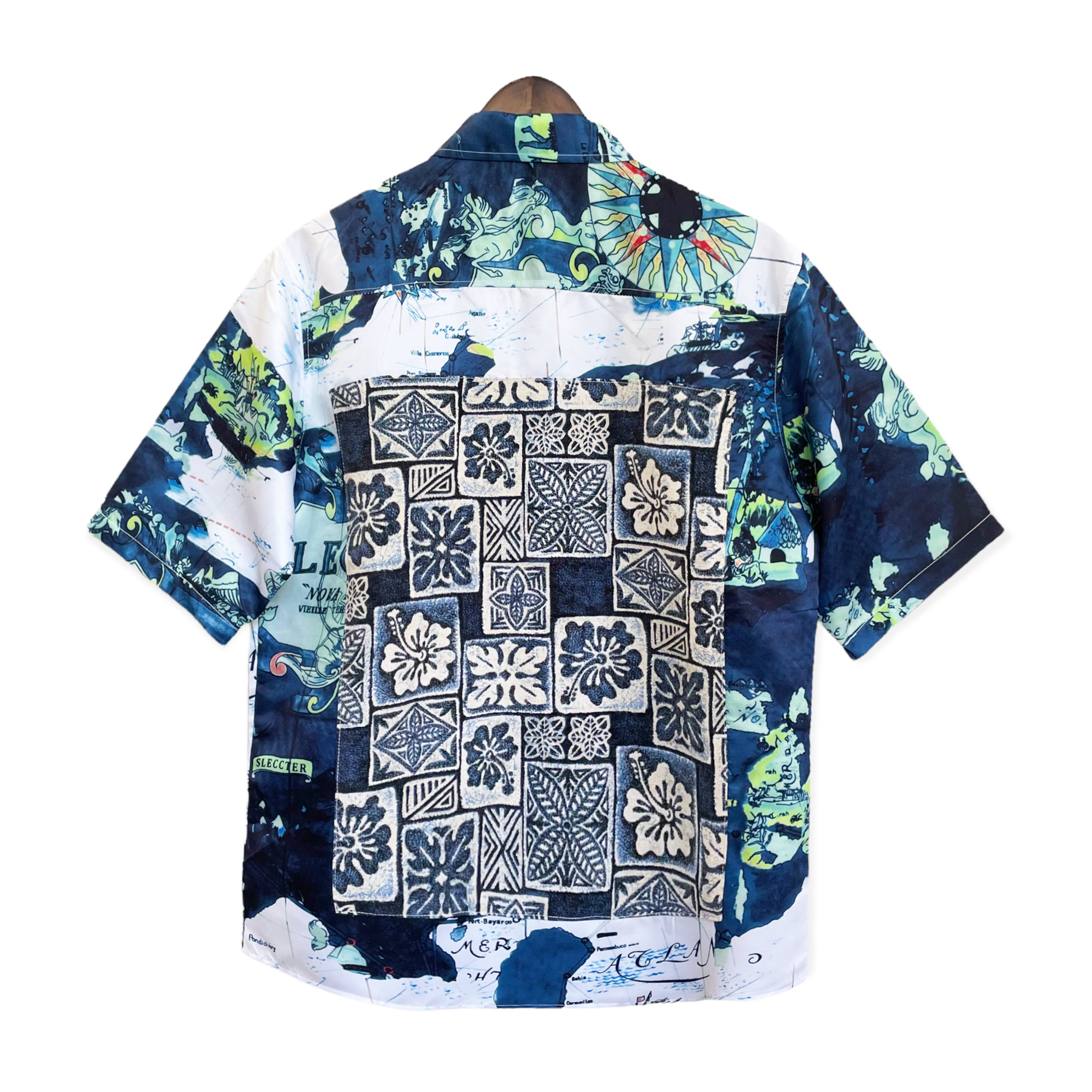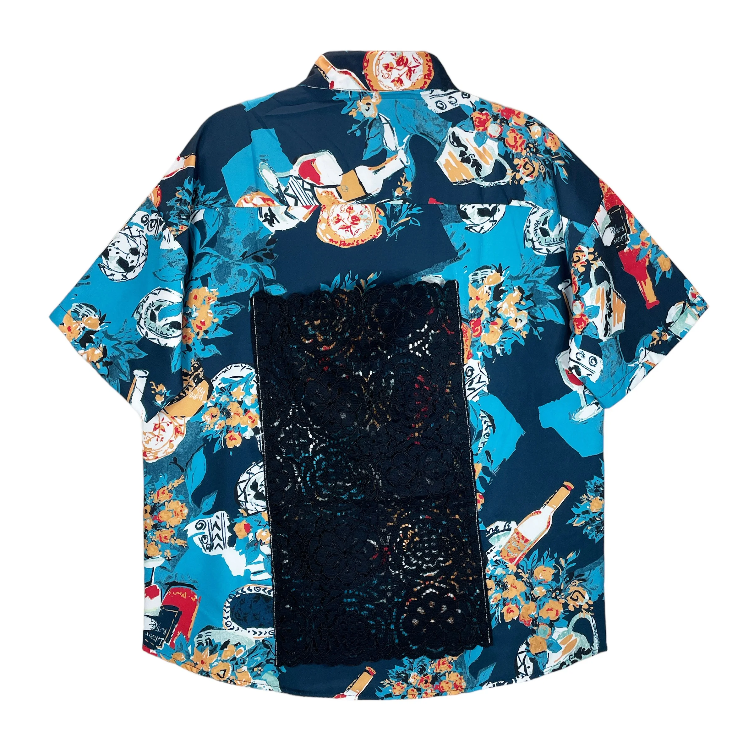 White Flowers Print Short Sleeves Handmade Blue Shirt