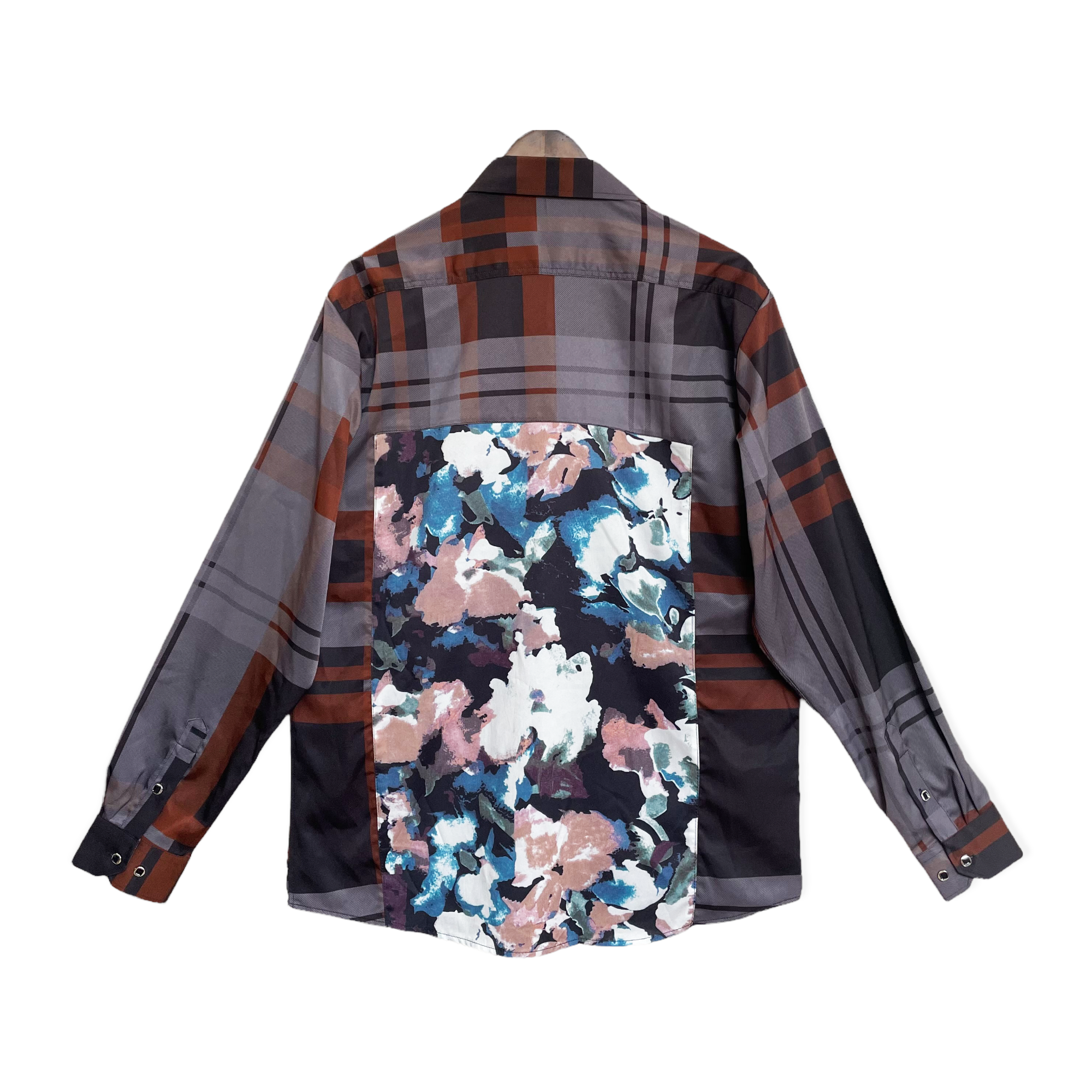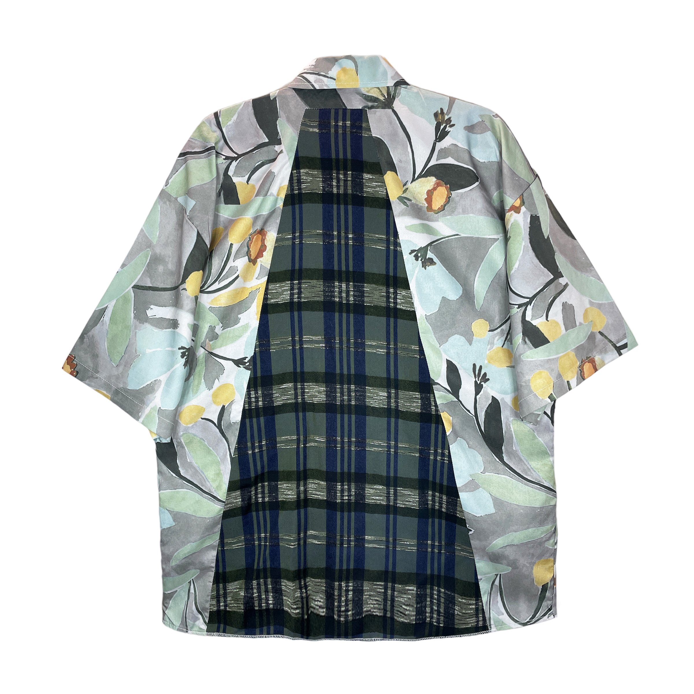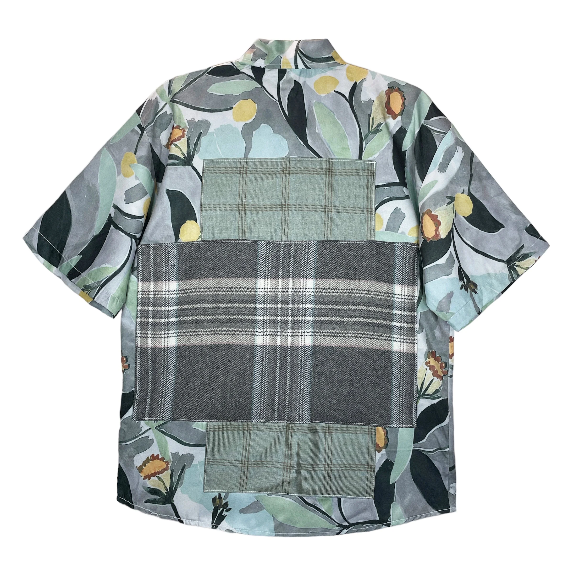 Green Watercolor Flowers Print Short Sleeves Handmade Gray Shirt