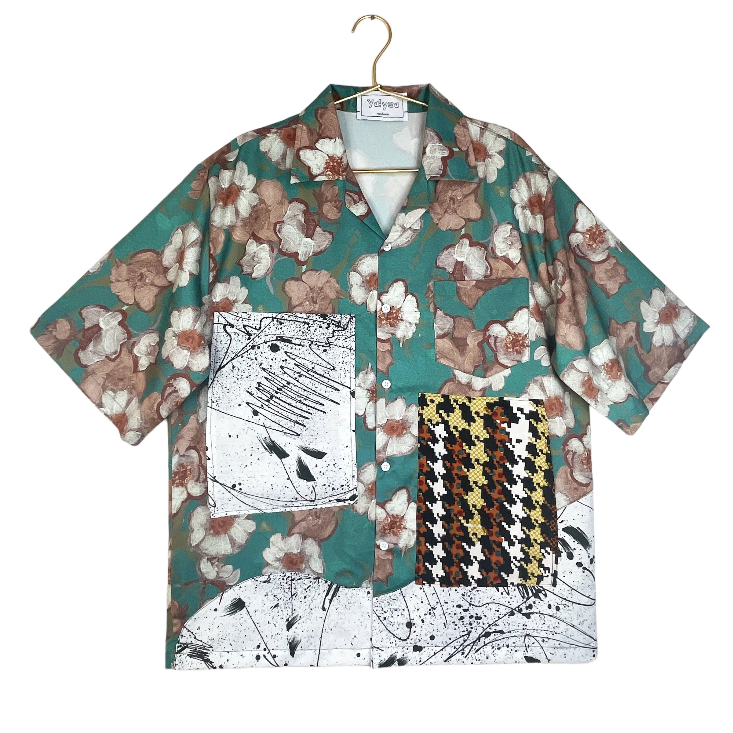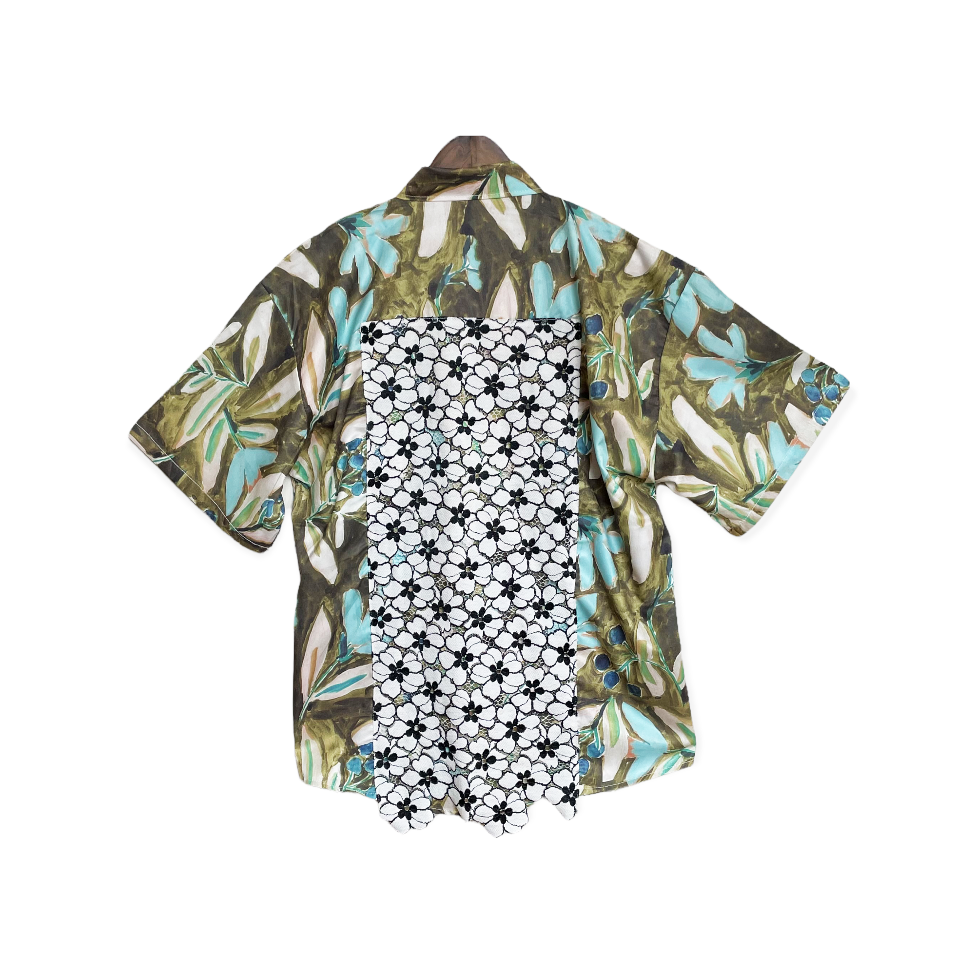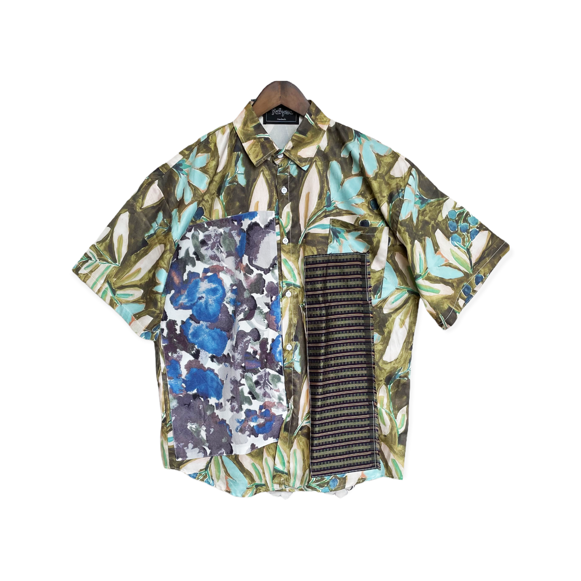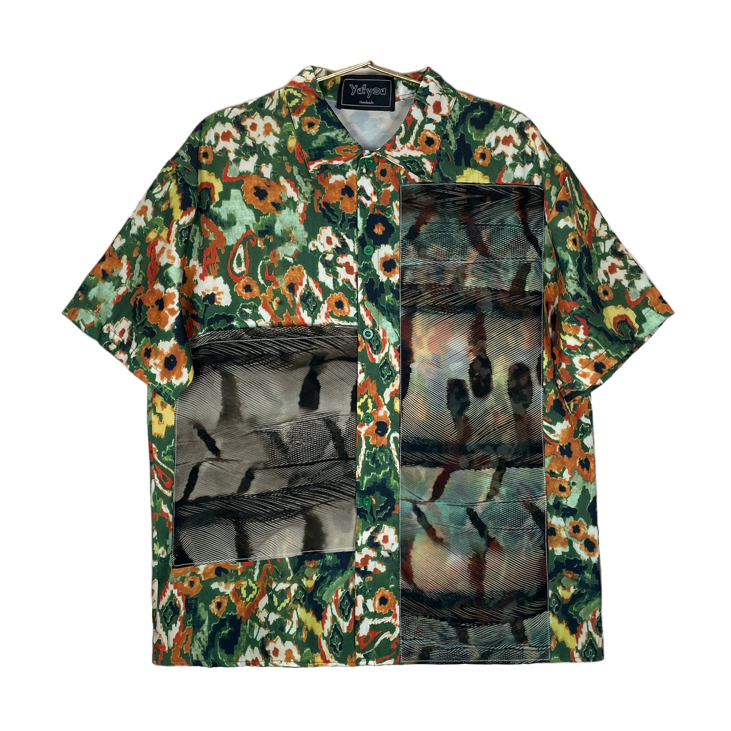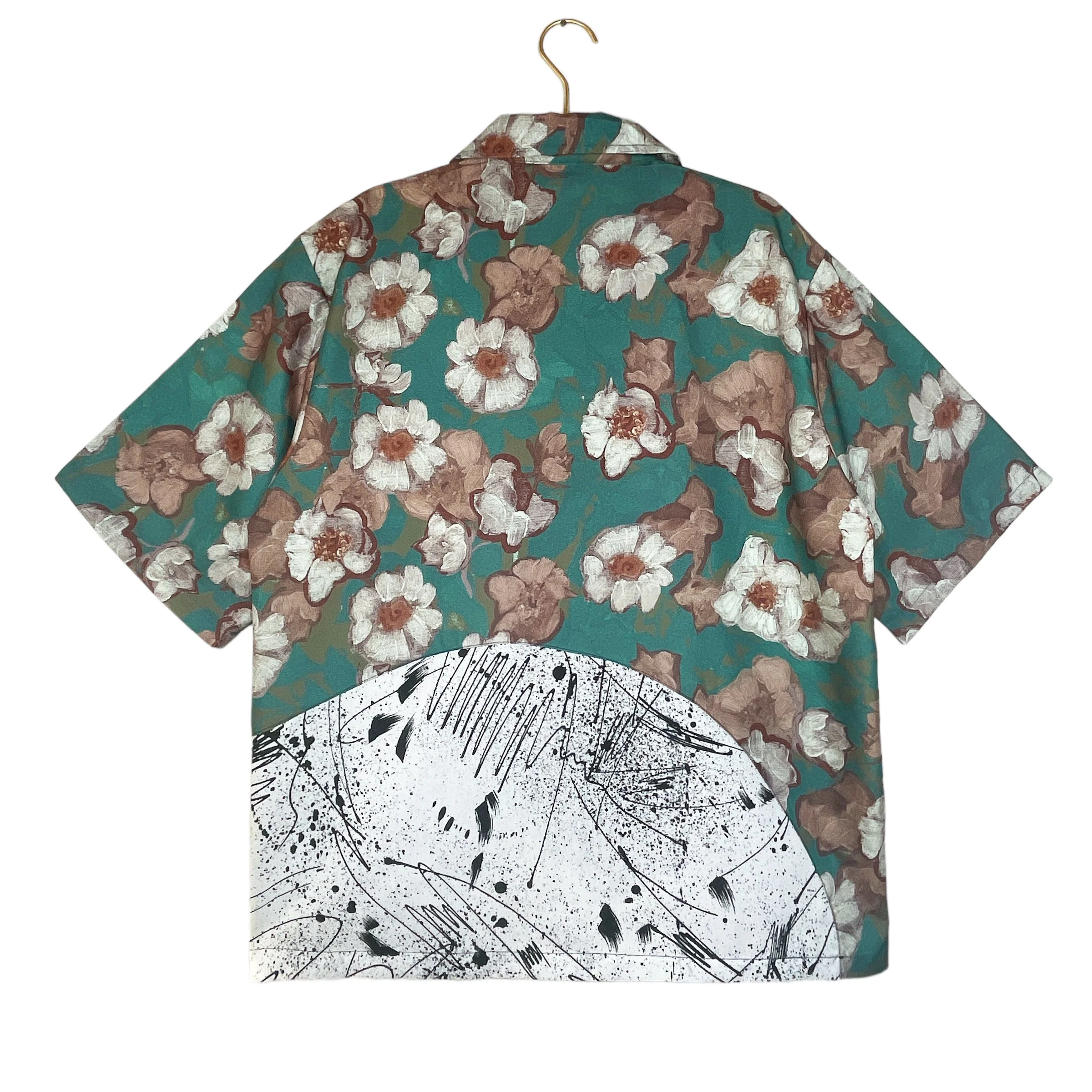 Spring Garden Print Short Sleeves Handmade Green Shirt