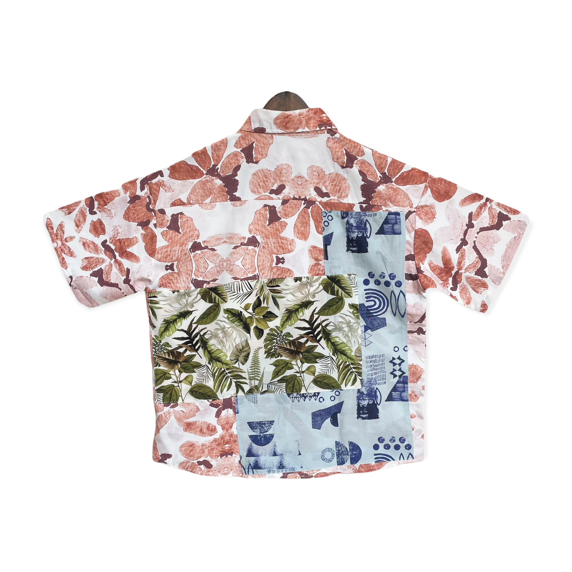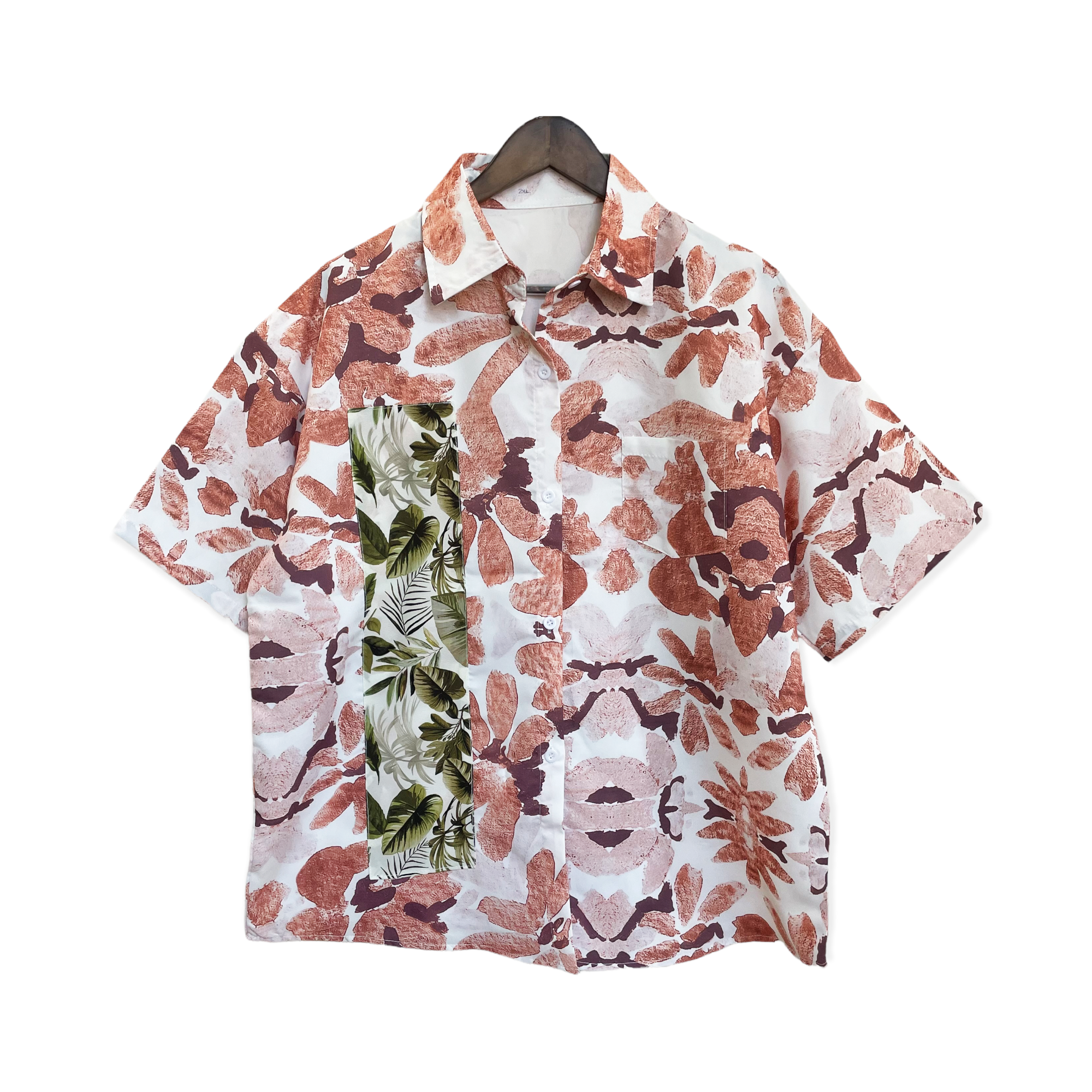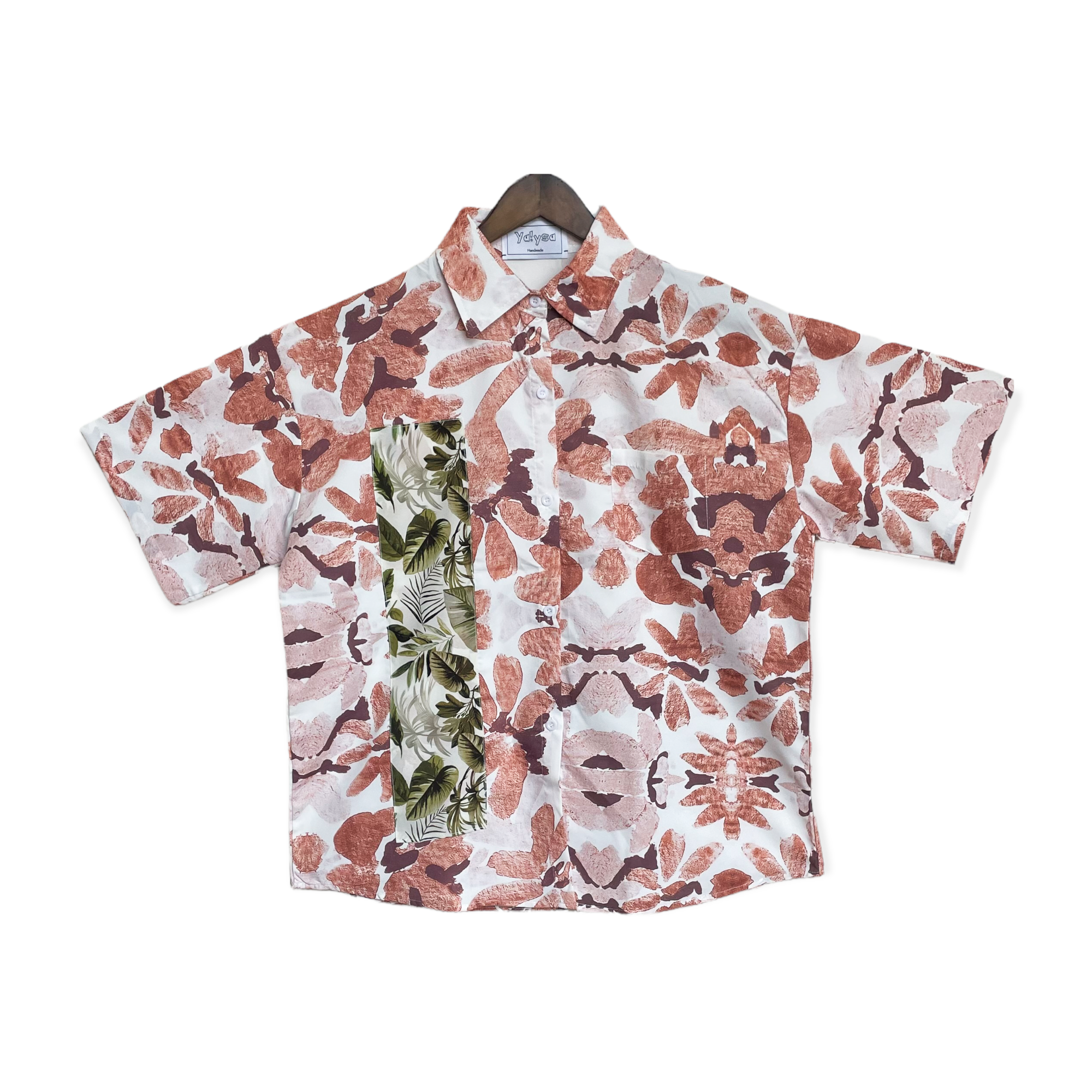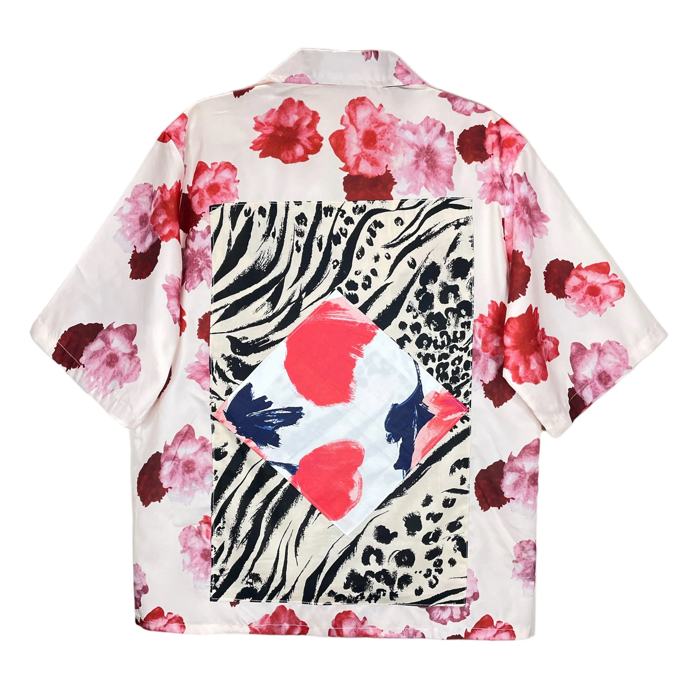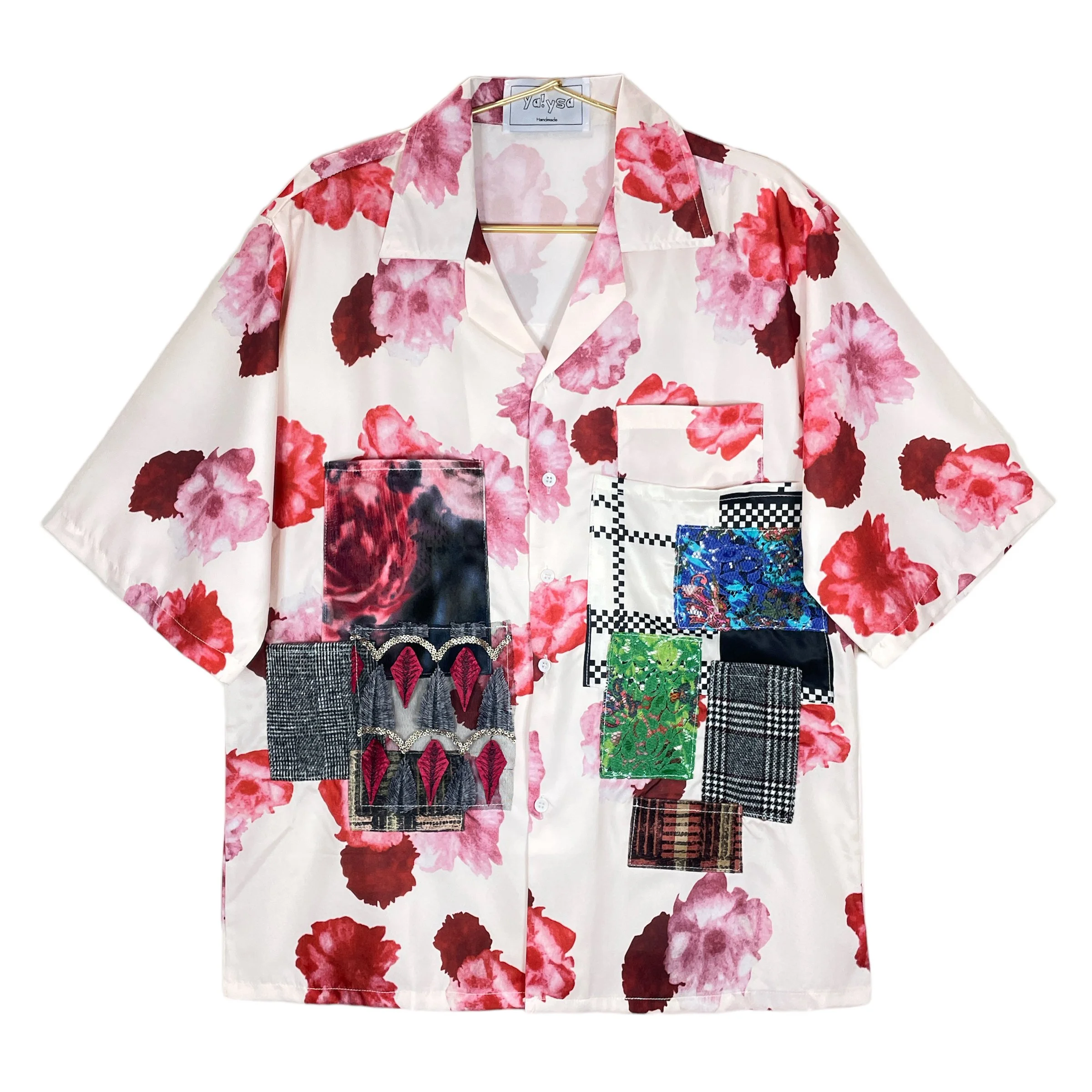 Ya!ysa Pink Flowers Print Short Sleeves Handmade Cream Shirt