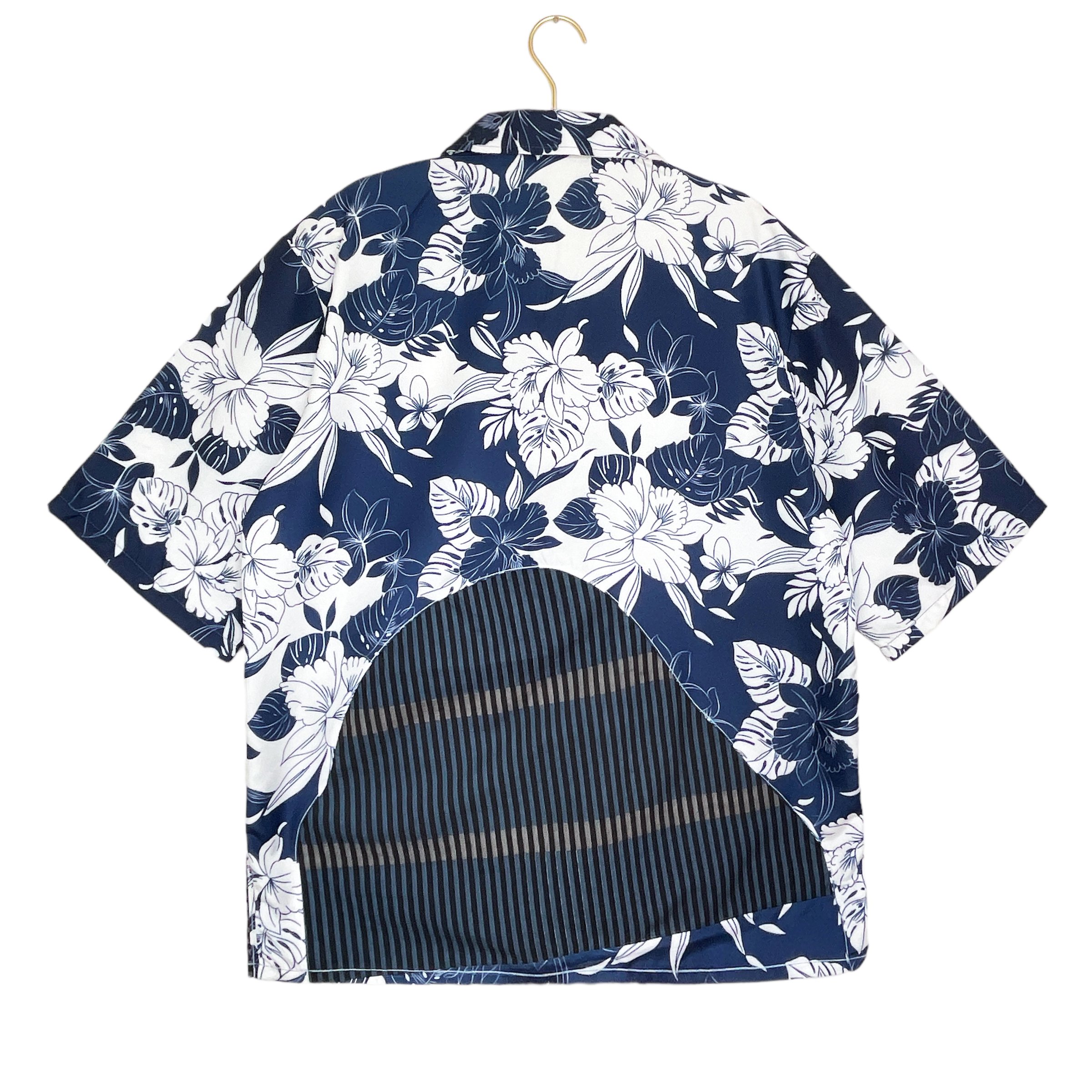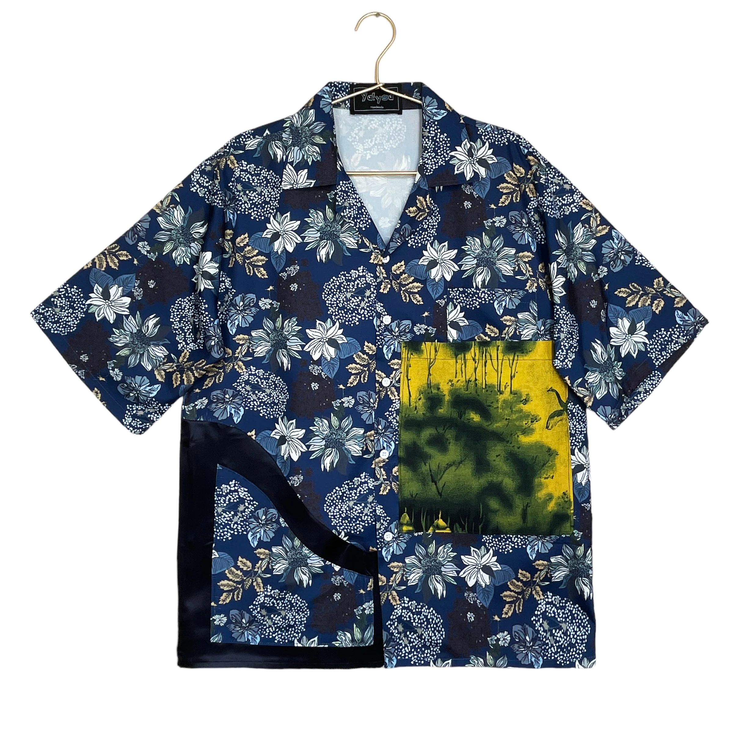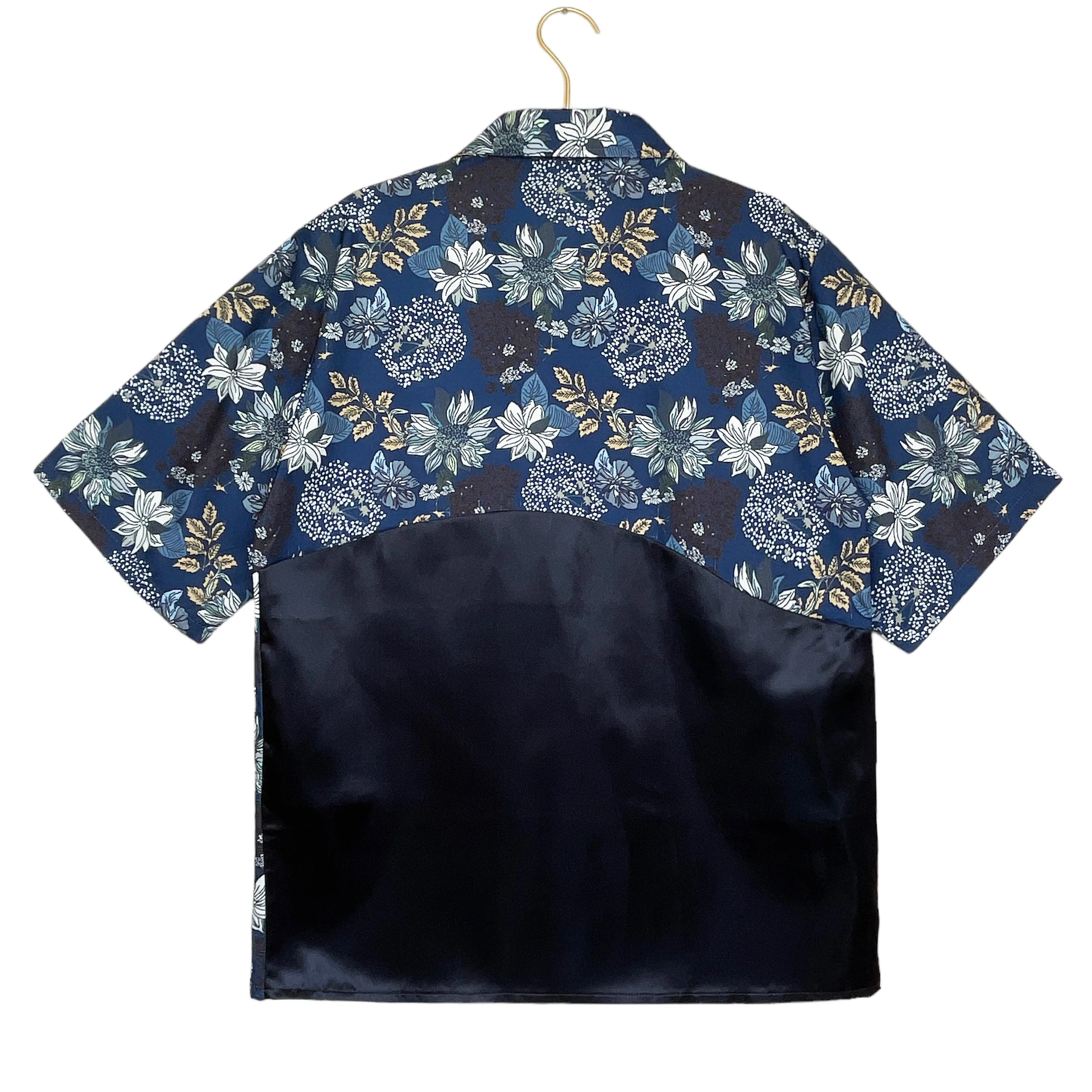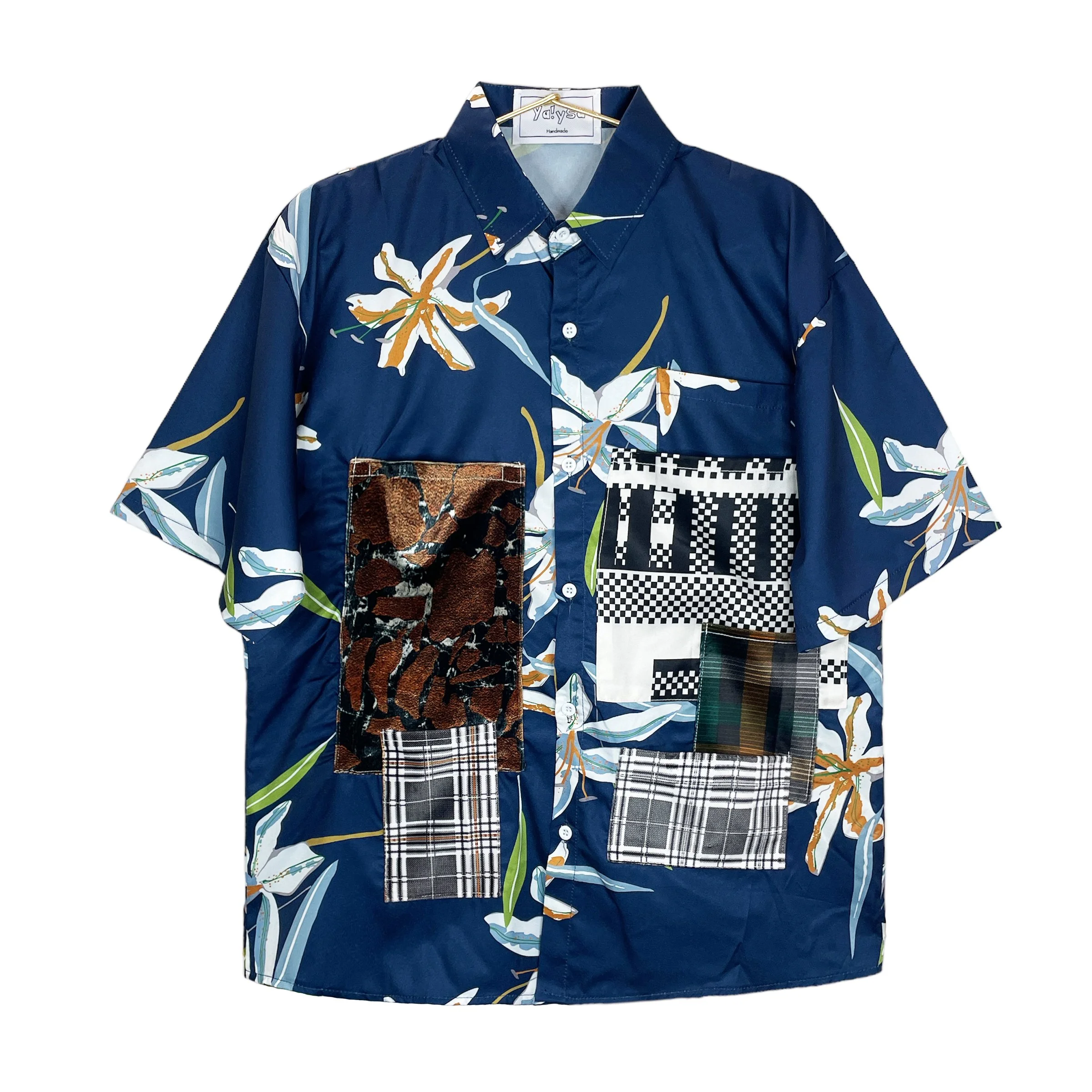 Lilies Flowers Print Short Sleeves Handmade Navy Blue Shirt