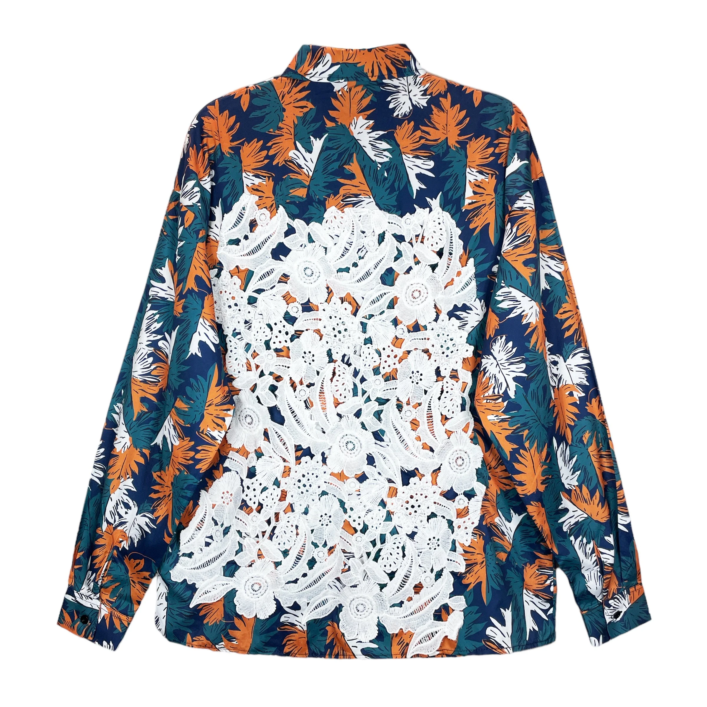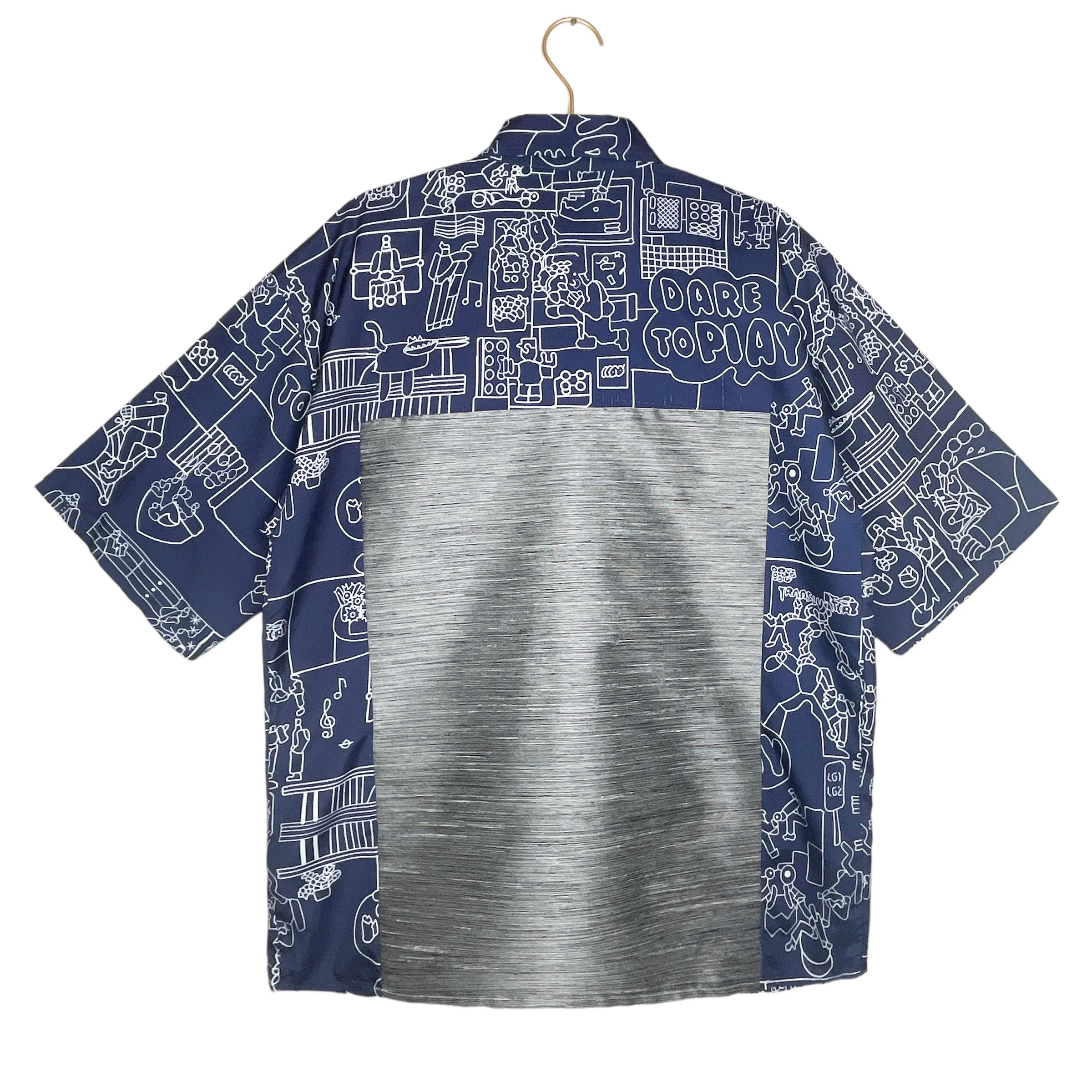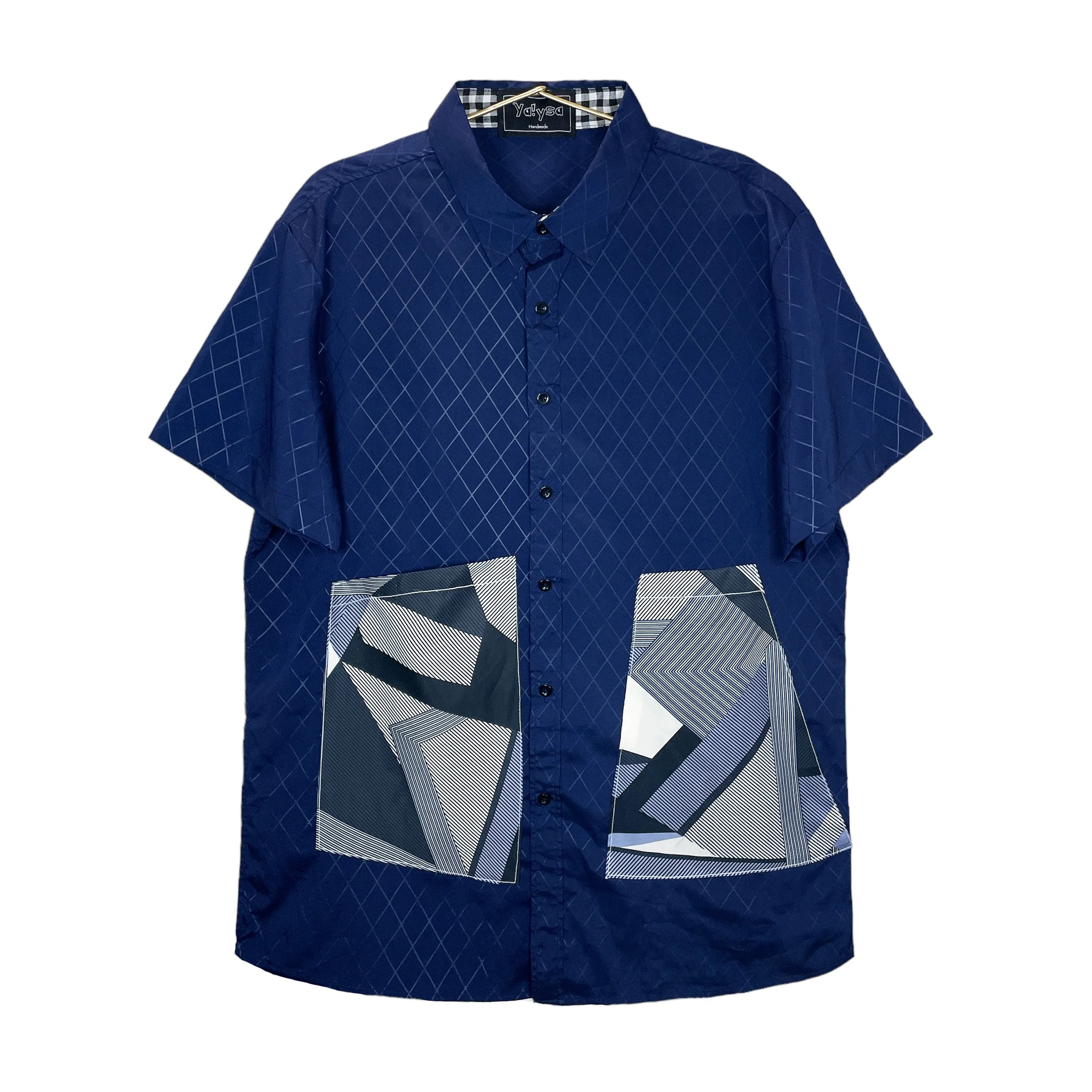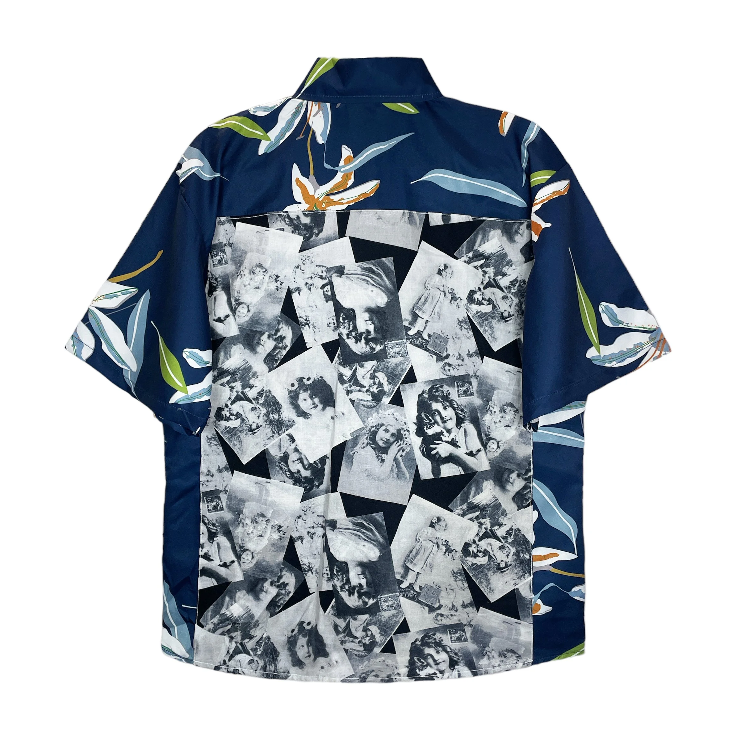 Lilies Flowers Print Short Sleeves Handmade Navy Blue Shirt