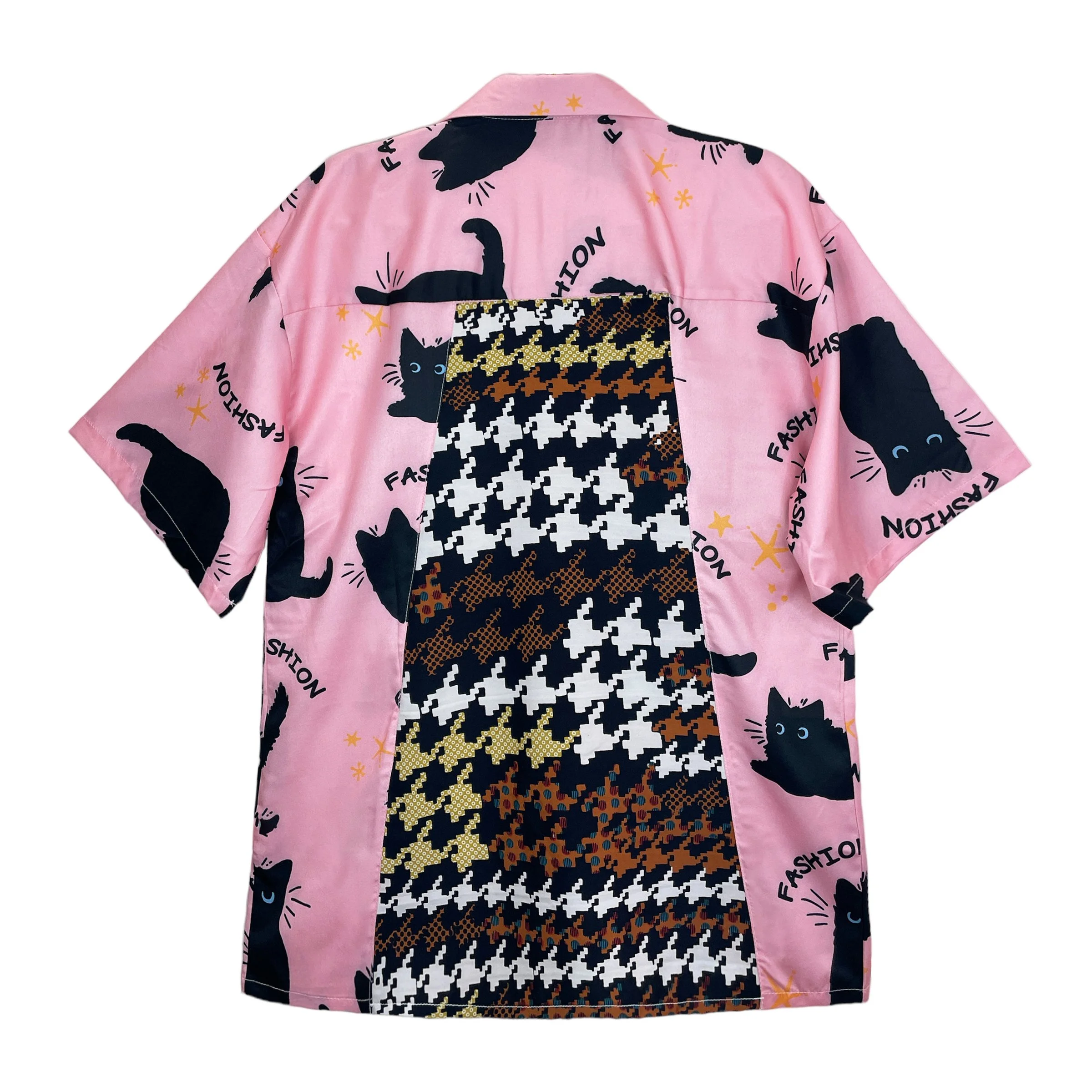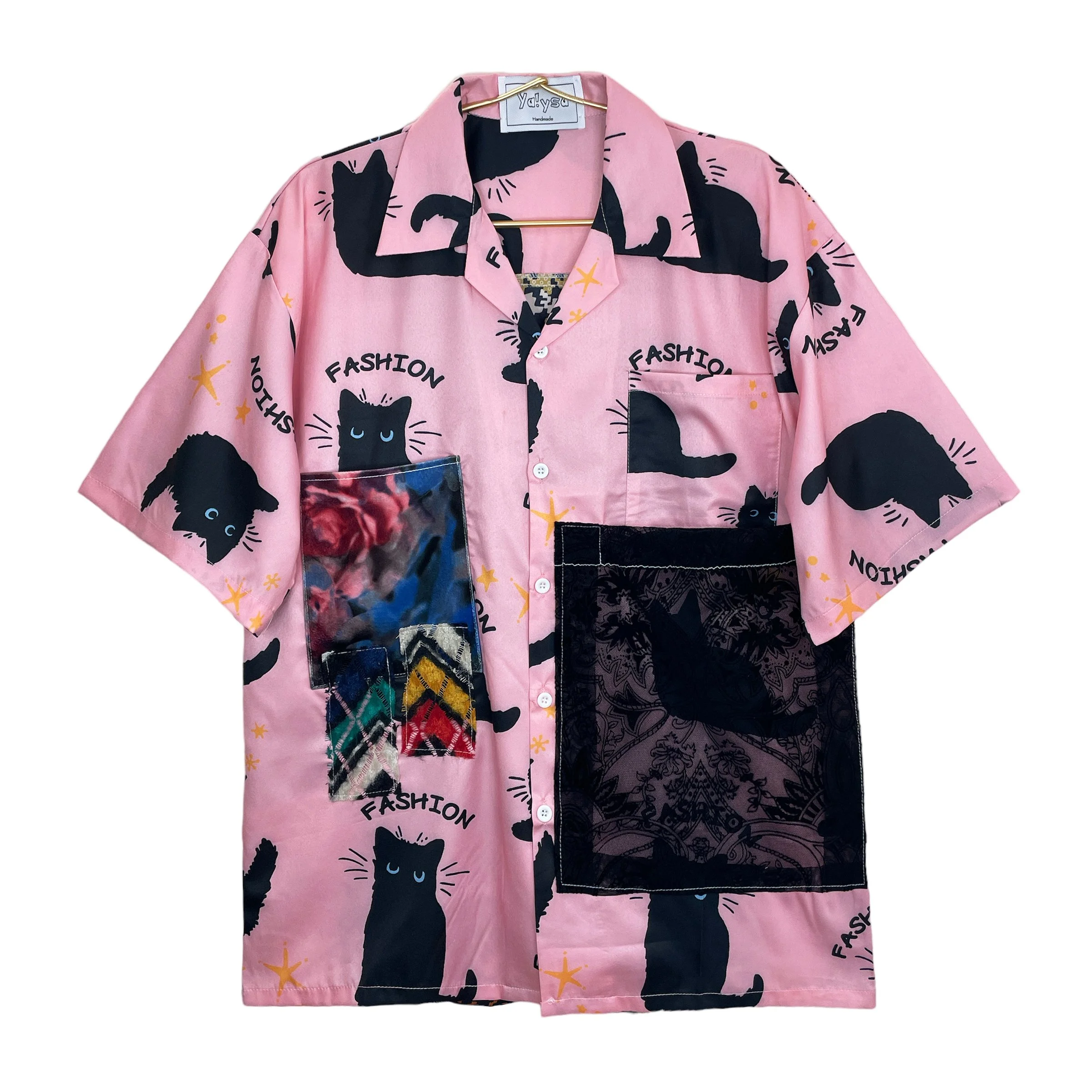 Black Cat Print Short Sleeves Handmade Pink Shirt