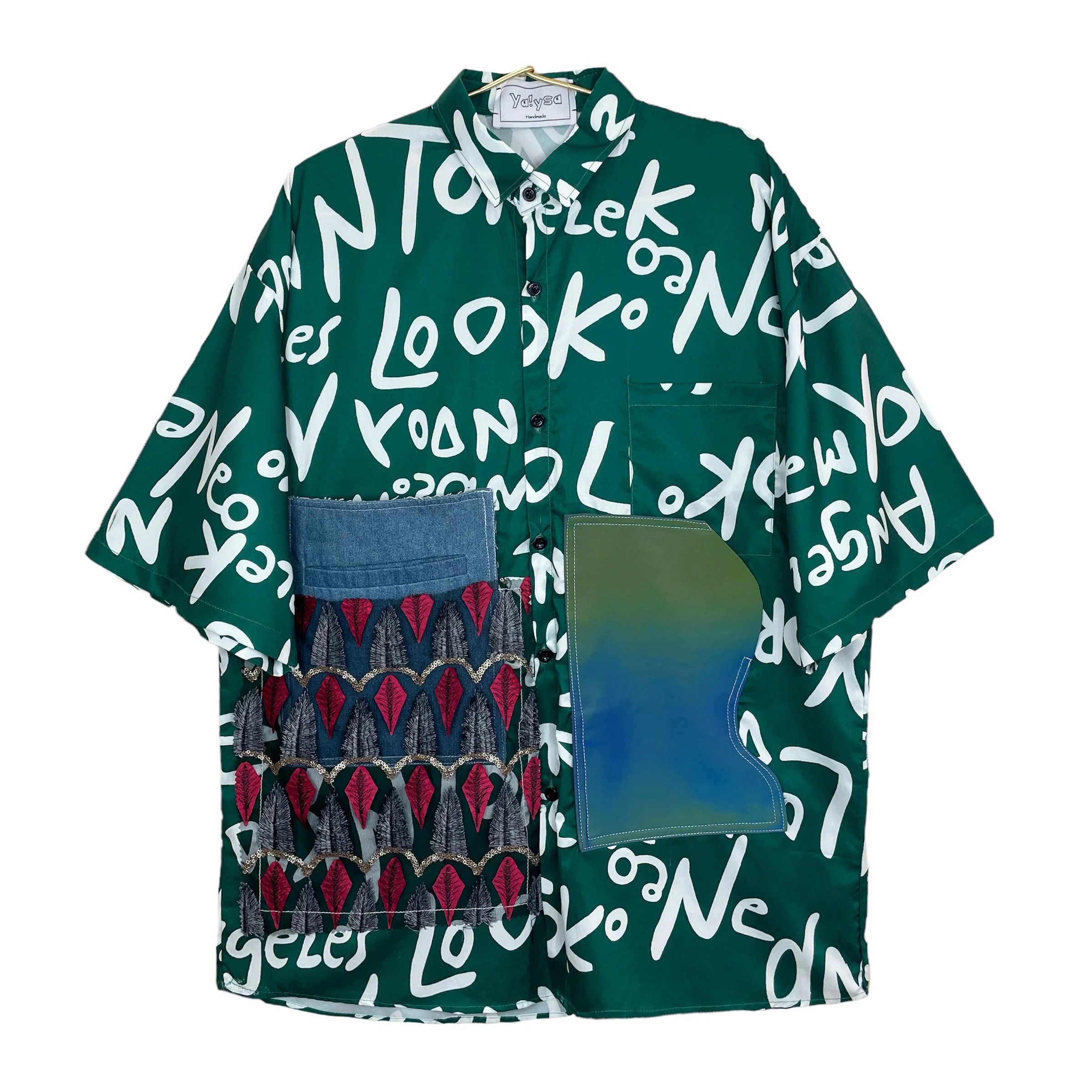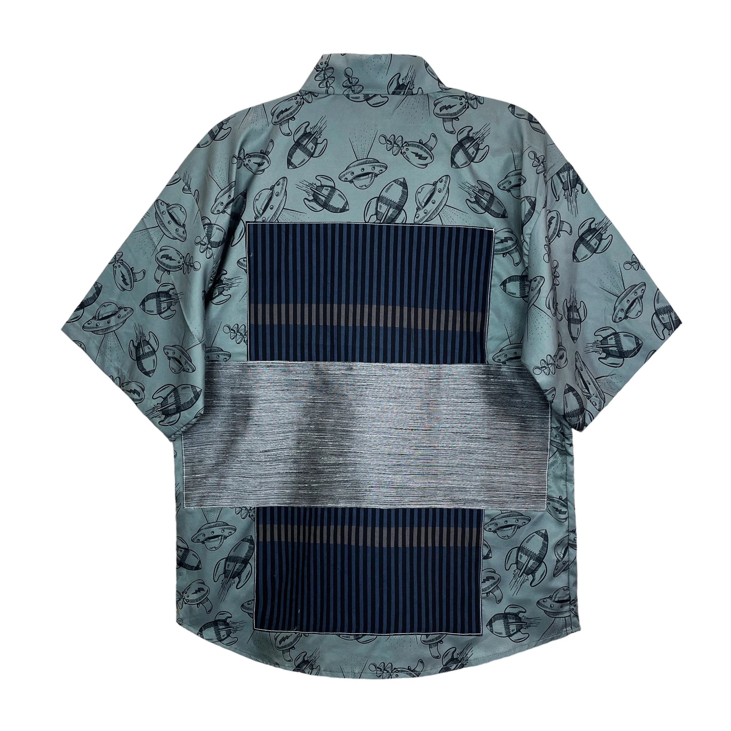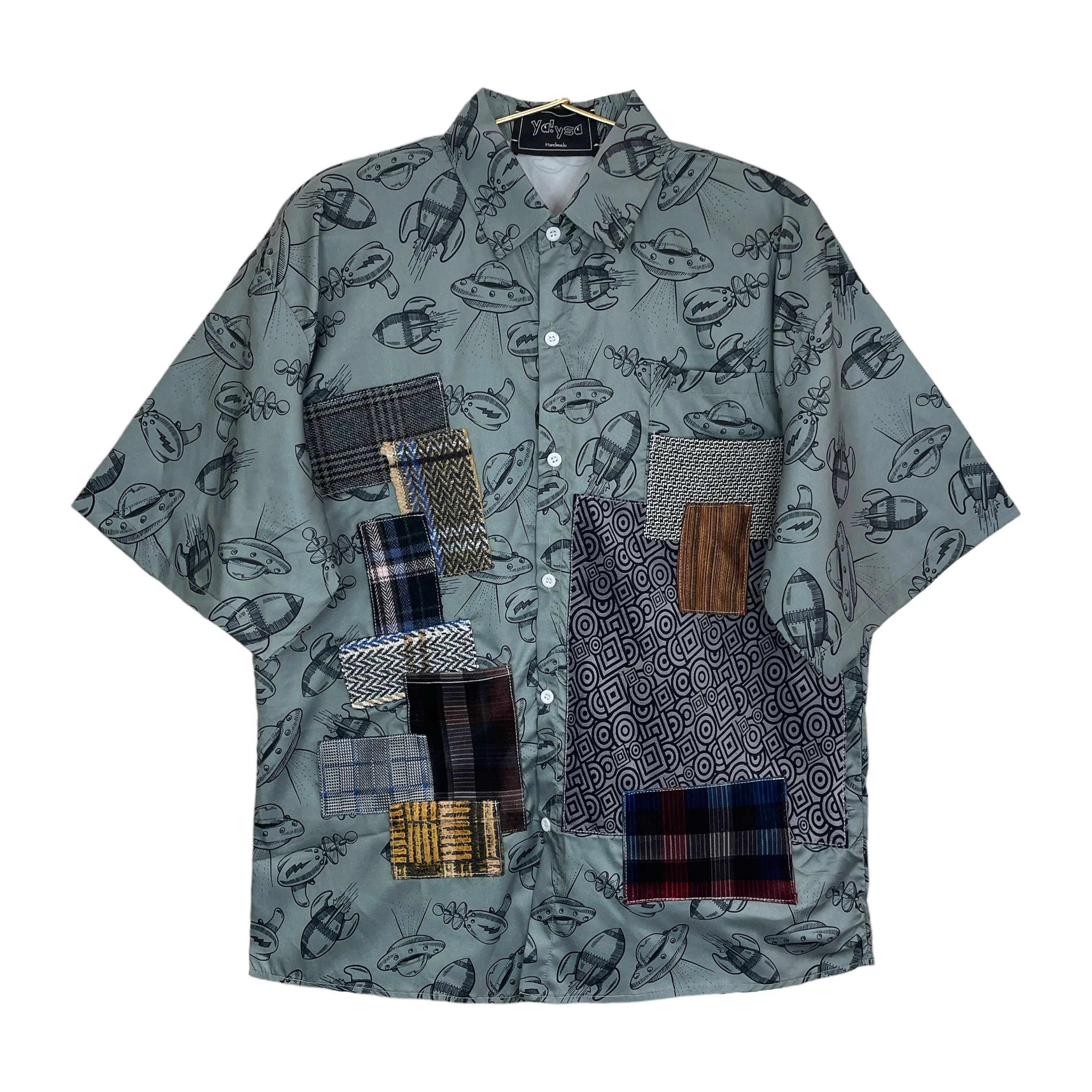 UFO and Rockets Print Short Sleeves Handmade Green Shirt