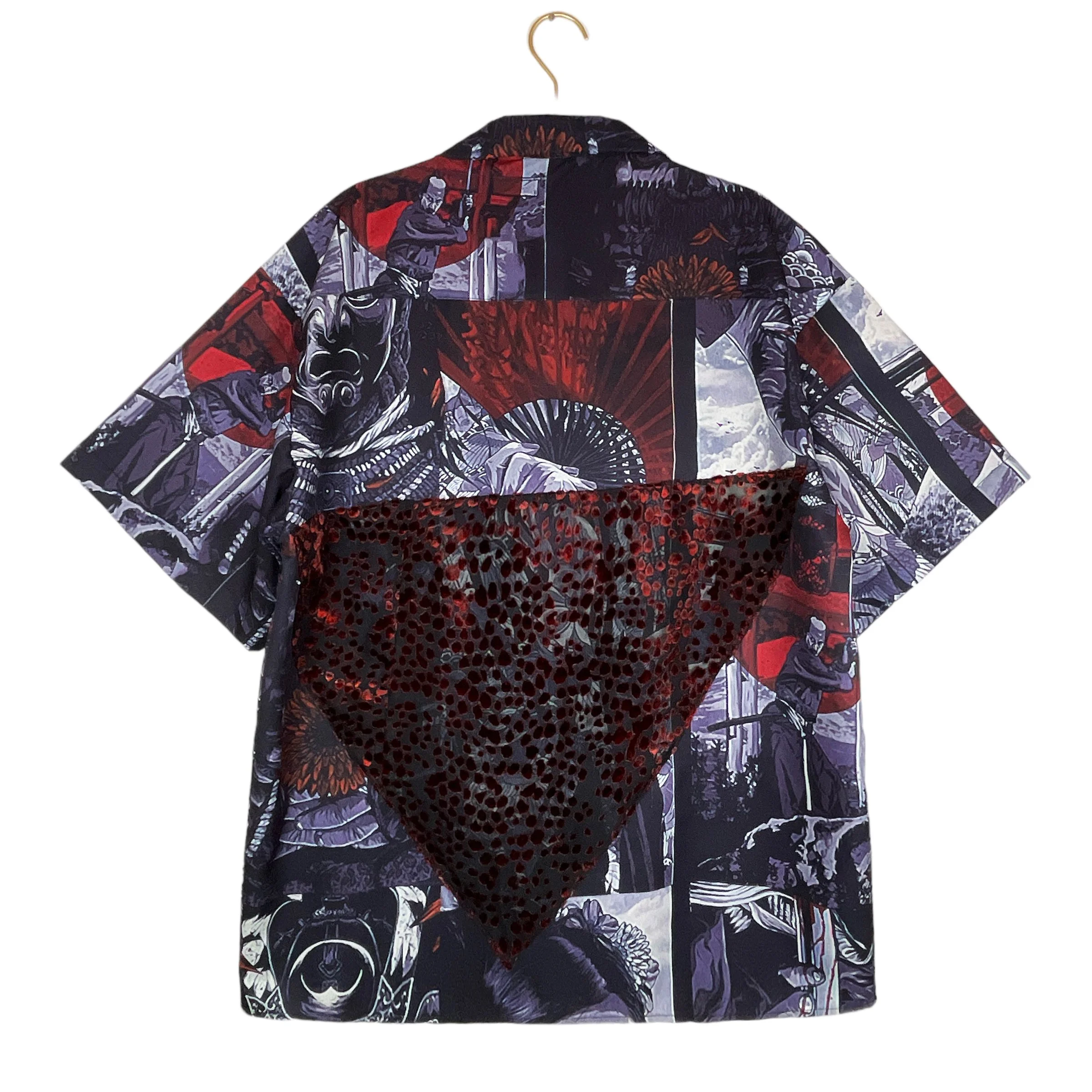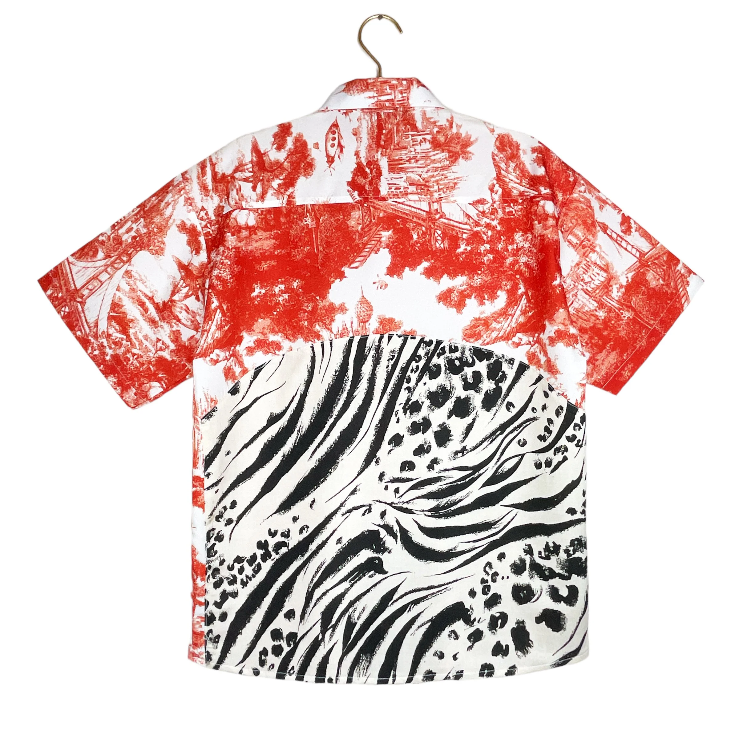 Red Flowers Print Short Sleeves Handmade White Shirt
